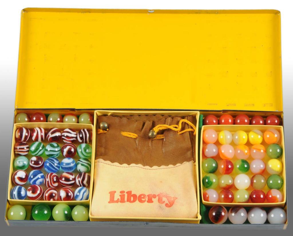 Includes 68 original marbles and bag. Beautiful example. Condition (Near Mint - Near Mint Plus). Size Box: 11" x 4 - 3/4".