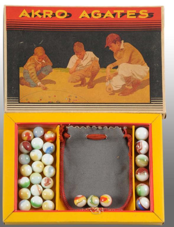 Includes 30 marbles and original bag. Marbles are an assortment of nice oxblood patches and three Popeye's. Popeye's may not be original to this box. Condition (Near Mint). Size Box: 8 - 1/4" x 6".