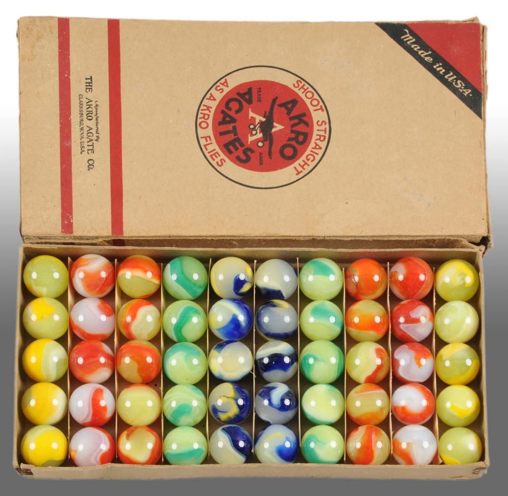 Includes 50 stunning and original marbles. Rare and beautiful box. Condition (Near Mint Plus). Size All: 1" Dia.