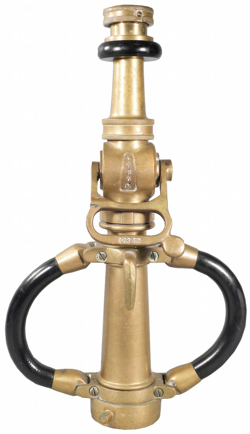 Akron Ball Fire Nozzle, E-5. Brass and rubber. Excellent original condition. 20 1/2 inches tall.