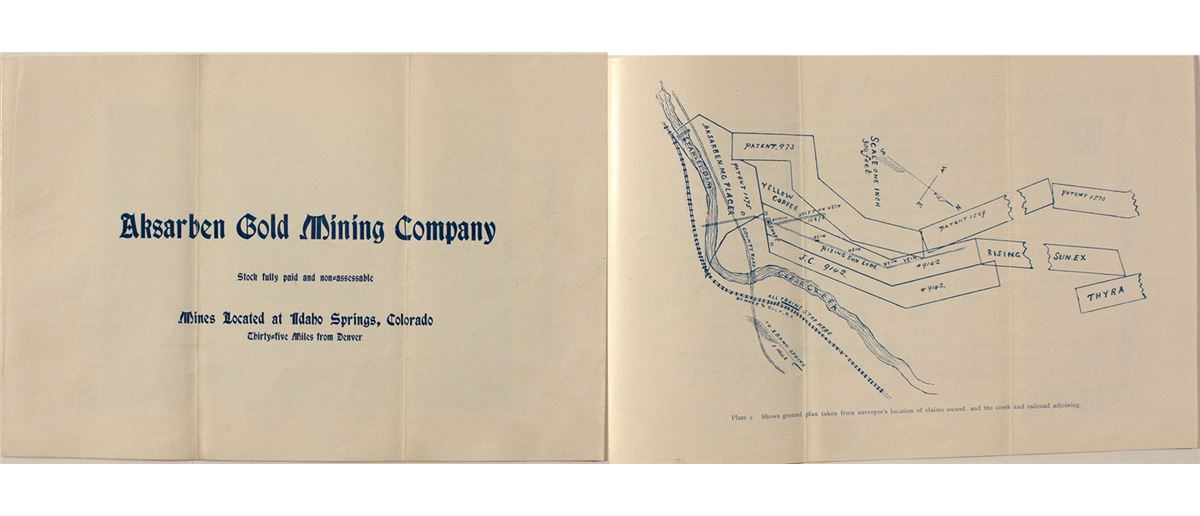 Only 35 miles from Denver at Idaho Springs in Chaffee County. 8 pages with one full page photograph, one claim map, and one cross section map. Blue writing on white pages. Short, but colorful!