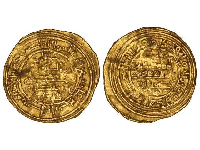 Al-Andalus Coins: Califhate - Dinar. 404H. KIRD a nombre de SULEIMAN. AL-ANDALUS. AU. Al morir Al-Haqem II, hombre instruido y uno de los grandes califas de Córdoba, le sucede Hixem II, menor de edad, con la tutela de su madre; Almanzor toma el gobierno del califato; muere éste el 392H, dejando a Hixem II, un califa inepto. Comienza entonces la desintegración del califato y las luchas por asumir el poder por diferentes príncipes omeyas. Entre el desorden y las luchas internas, diversos gobernadores se independizan usando el nombre de un califa de facto, como Suleimán; aquí comienza el período llamado Reinos de Taifas. Este Dinar con el nombre de Kird o Kard sin duda corresponde a un primer gobernador independiente usando el nombre de Suleimán. En este caso bajo la denominación Al Andalus con toda seguridad se oculta un territorio y una ciudad cuyo nombre, tras posteriores estudios, quizás pueda salir a la luz. RARÍSIMA. SÓLO SE CONOCE OTRO EJEMPLAR DE CUÑOS DIFERENTES. V-801. MBC+.