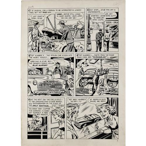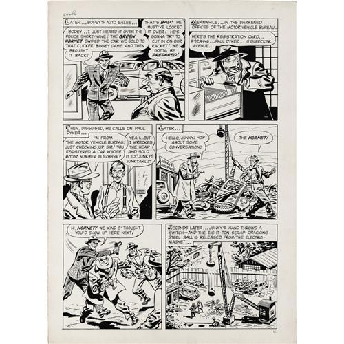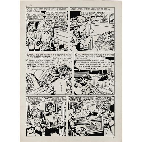 <B>Al Avison - Green Hornet Fights Crime #41 Complete 8-page Story "Crime On Wheels" Original Art (Harvey, 1949).</B></I> The Green Hornet and Kato put the kibosh on a hot car mob in this fast and furious eight-pager. The image area of each page measures 12.5" x 18". Page one is missing its title logo stat and other type elements are coming loose; otherwise, the pages are in Very Good condition. <BR><BR><B>Important notice:</B> Heritage usually auctions material at the rate of 200-250 lots per hour. On some occasions eBay Live bid software or the Internet may not be able to keep up with the pace of the auction. We recommend placing a realistic absentee bid now as insurance to avoid disappointment. Occasionally the auctioneer may eliminate or reject an eBay Live bid, and the auctioneer may also reopen a lot after the close of the eBay live bidding (usually because we missed an audience bid), and may reject your bid even if it shows you as the winning bidder. By bidding via eBay Live, you agree that Heritage may award the lot to another bidder at its sole discretion under the circumstances described above or any other reasonable circumstances. Since eBay bids are not shown to us until we open the lot on the floor, we treat those bids just like floor bids. In most cases the floor responds before the eBay bid is presented to us, due to Internet lag time, so for consistency we have made it a policy that floor bids are always considered first over tie eBay live bids. Also please note that all Heritage lots purchased through eBay Live carry a 22.5% Buyer's Premium. Please make sure you read the Terms and Conditions before you bid. This lot is being auctioned in conjunction with a live floor auction by Heritage Auction Galleries. All final auction and invoice information will be supplied by Heritage Auction Galleries, and all other information should be considered preliminary. Lot:41001 <BR><BR><B>Winning Notification and Billing:</B> After the FINAL session in this auction is complete, Heritage will send e-mail and snail mail invoices. This process normally takes several days. All final auction and invoice information will be supplied by Heritage Auction Galleries, and all other information should be considered preliminary. <BR><BR>This auction will be conducted on a live auction floor and over the Internet through eBay Live. If you choose to place an absentee bid, please take a moment to <font color='#0000ff'><u><a href='http://pages.ebay.com/liveauctions/help/before/laabsentee.html'>learn how eBay Live absentee bidding works</a></u></font><font color='#000000'>