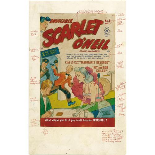 <B>Al Avison (attributed) - Invisible Scarlet O'Neil #1 Cover Original Art (Harvey, 1950).</B></I> When a beautiful girl discovers that she has the power to become invisible, there's bound to be plenty of adventure! Russell Stamm's imaginative adventure heroine got her own series from Harvey Comics in 1950, beginning with this issue. The art has an image area of 11" x 17". The logo and masthead art at the top is recent replacement art, and Scarlet's face has been replaced with a photostat. There is some aging apparent, with light soiling, and glue staining (especially at the upper portion around the logo); otherwise the condition is Good. Also includes a 7" x 10.5" hand-colored color guide, which has been mounted onto a 9" x 14" sheet of illustration board (in Good condition), and a copy of <B>Invisible Scarlet O'Neil</B></I> #1.