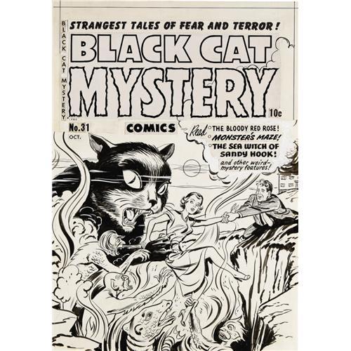 <B>Al Avison (attributed) - Black Cat Mystery #31 Cover Original Art (Harvey, 1951).</B></I> As all hell breaks loose, it's a struggle for survival between a mortal couple and a host of unsavory fiends from down below, in this menacing cover illustration by Al Avison! The image area measures 12.25" x 17", and, aside from some slight paper tanning, the condition is Excellent. Includes all the original logo and type paste-ups.<BR><BR><b>Shipping:</b> Small Flat (<a target="_blank" href="http://www.heritageauctions.com/common/shipping.php">view shipping information</a>)