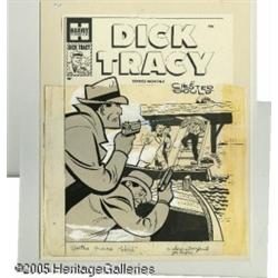 <B>Al Avison (attributed) - Dick Tracy Comics Monthly #83 Cover Original Art (Harvey, 1955).</B></I> Three thugs on the waterfront shoot it out with Dick Tracy and Sam Catchem -- a terrible tactic! The foreground figures of Tracy and Sam Catchem are stats, but the villains in the background are all original art. A moderate use of white-out, and some glue staining is apparent along the right edge; the logo is a recent replacement, and the art has been mounted to a support board; otherwise the art is in Very Good condition. The image area measures 14.5" x 18". Dick Tracy remains the ultimate crime-stopper and here is a sensational cover scene! <I>From the collection of Larry Doucet.</B></I>