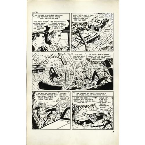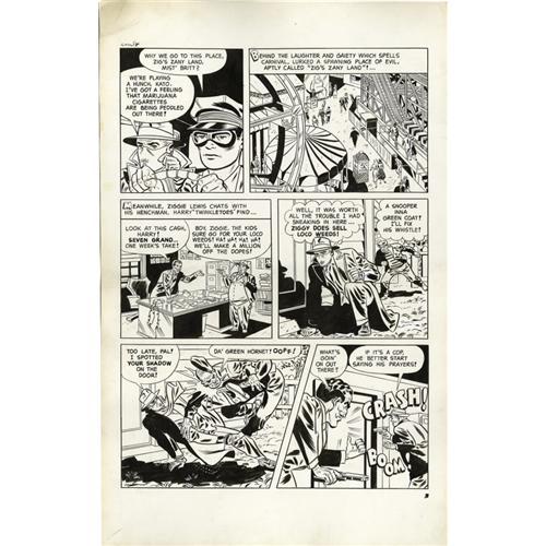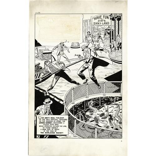 <B>Al Avison (attributed) - Green Hornet #46, Complete 8-page Story "The Marijuana Racket!" Original Art (Harvey, 1949).</B></I> When the Green Hornet discovers a vicious dope ring being operated outside the law, he finds himself in a grim duel of death in the case of "The Marijuana Racket!" This "hopped up" story is brought to you by Al Avison. Each page has an image area of 12.5" x 18". There is some overall aging apparent, and some glue staining in the first panel of page one from a missing logo paste-up; otherwise, the pages average in Very Good condition.