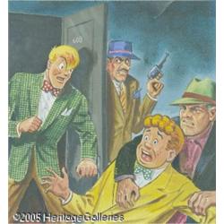 <B>Al Avison (attributed) - Joe Palooka Comics Cover Original Art (Harvey, 1956).</B></I> You want Joe Palooka in rich, fully painted color? You got it! Harvey mainstay Al Avison handles his paints with as much gusto as his inks, and puts together a thrilling chromatic masterwork, a hybrid between line and tone, dazzlingly bright, and fairly untouched by age. Once again, Joe has to pull the fat out of the fire (so to speak), when he walks into a hotel room full of extortionists with an eye for his pal, Humphrey Pennyworth. This piece has an image area of 10.75" x 11" and has been painted on thick illustration board. There is a small tear at the upper right edge, but otherwise the condition is Excellent.