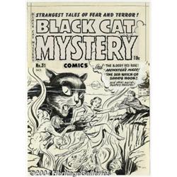 Al Avison (attributed) - Original Cover Art for Black Cat Mystery #31 (Harvey, 1951). Al Avison puts the black cat, literally, on the cover of this issue of Black Cat Mystery from 1951. All hell breaks loose on this unfortunate lady, as her friend struggles frantically to pull her out of danger, in this 12.5" x 19" image. The work shows some slight aging, but is in overall excellent condition. Includes all the original logo and type paste-ups. A must-have cover from the Golden Age of Harvey Comics horror! Important notice: Heritage usually auctions material at the rate of 200-250 lots per hour. On some occasions eBay Live bid software or the Internet may not be able to keep up with the pace of the auction. We recommend placing a realistic absentee bid now as insurance to avoid disappointment. Occasionally the auctioneer may eliminate or reject an eBay Live bid, and the auctioneer may also reopen a lot after the close of the eBay live bidding (usually because we missed an audience bid), and may reject your bid even if it shows you as the winning bidder. By bidding via eBay Live, you agree that Heritage may award the lot to another bidder at its sole discretion under the circumstances described above or any other reasonable circumstances. Since eBay bids are not shown to us until we open the lot on the floor, we treat those bids just like floor bids. In most cases the floor responds before the eBay bid is presented to us, due to Internet lag time, so for consistency we have made it a policy that floor bids are always considered first over tie eBay live bids. Also please note that all Heritage lots purchased through eBay Live carry a 20% Buyer's Premium. Please make sure you read the Terms and Conditions before you bid.