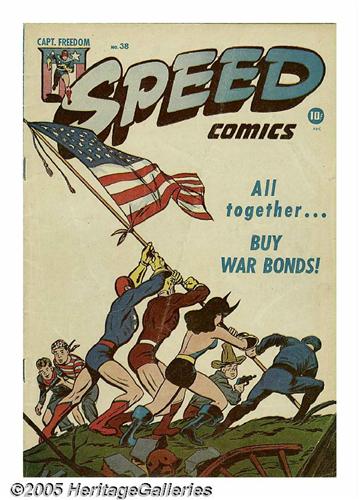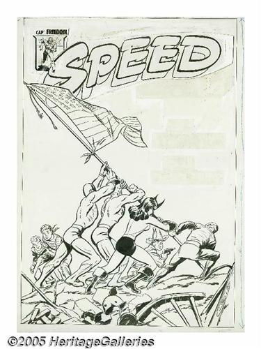 <B>Al Avison (attributed) - Speed Comics #38 Cover Original Art (Harvey, 1945).</B></I> The famous Joe Rosenthal photograph of the flag being raised over Iwo Jima was taken on February 23, 1945, and this patriotic tribute hit the stands just three months later -- talk about a fast turnaround! Harvey's roster of superheroes fill in for the soldiers, but the message is the same -- we win! This cover has some noticeable glue staining on the right side where the text stats have fallen off, and there's heavy use of white-out around the logo, but overall the art is in Very Good condition. The image area measures 13" x 19". Also included is a copy of the printed comic book. A cool cover re-creating a pivotal moment from the second World War.