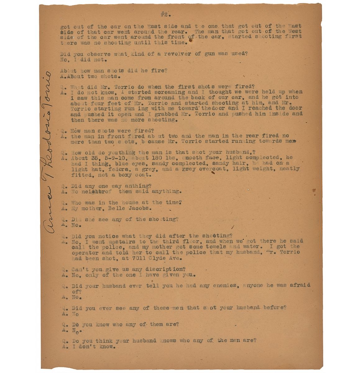 The first page provides the facts surrounding the shooting stating that it took place at 3:30 P.M. at 7011 Clyde Avenue. Page states Torrio had “3 superficial gun shot wounds,” with the cause stating “While alighting from his automobile from the front of the above address was assaulted by three men, two of the men fired several shots at him, causing above injuries. The assailants then jumped into a dark cadillac touring car.” Capone's police interrogation took place the same day as Torrio's near fatal shooting.