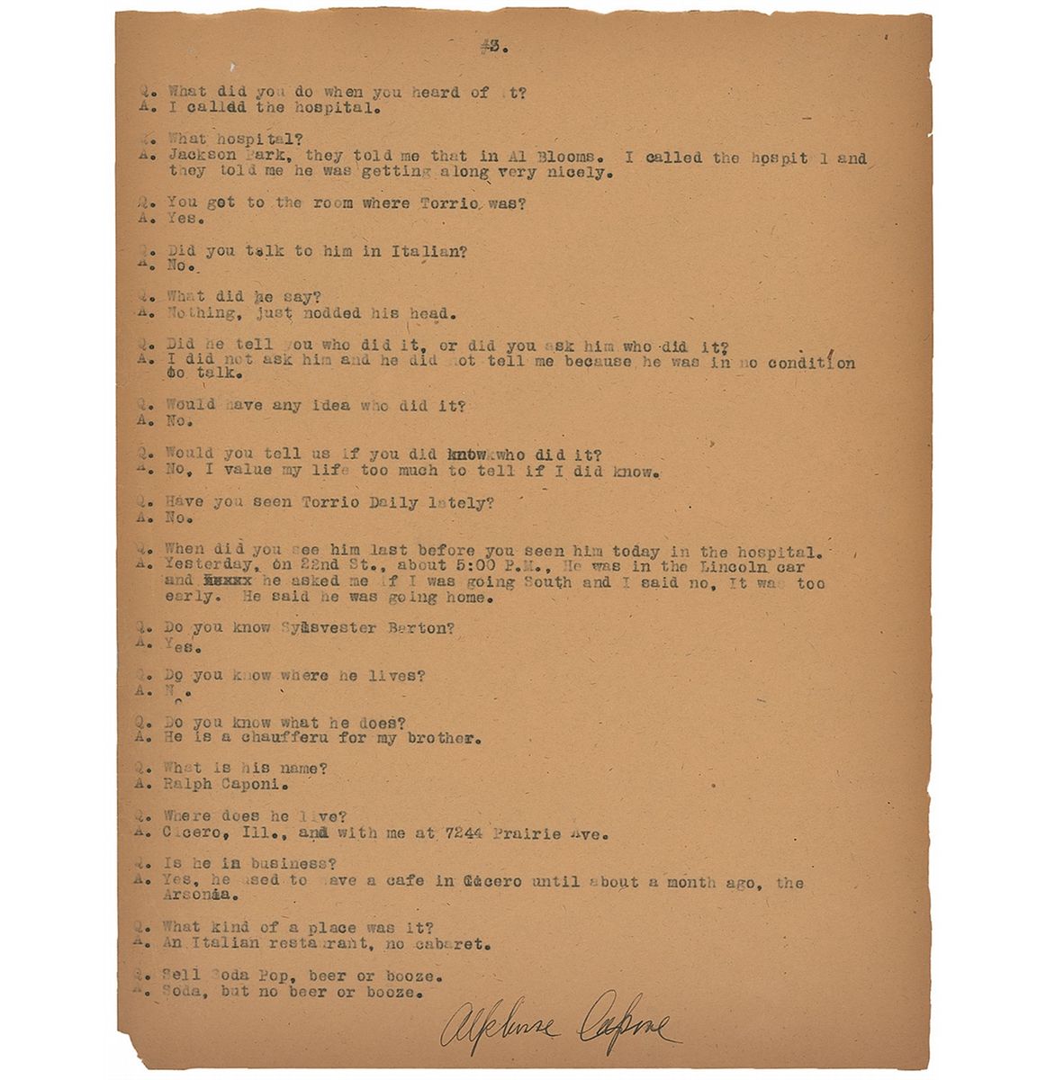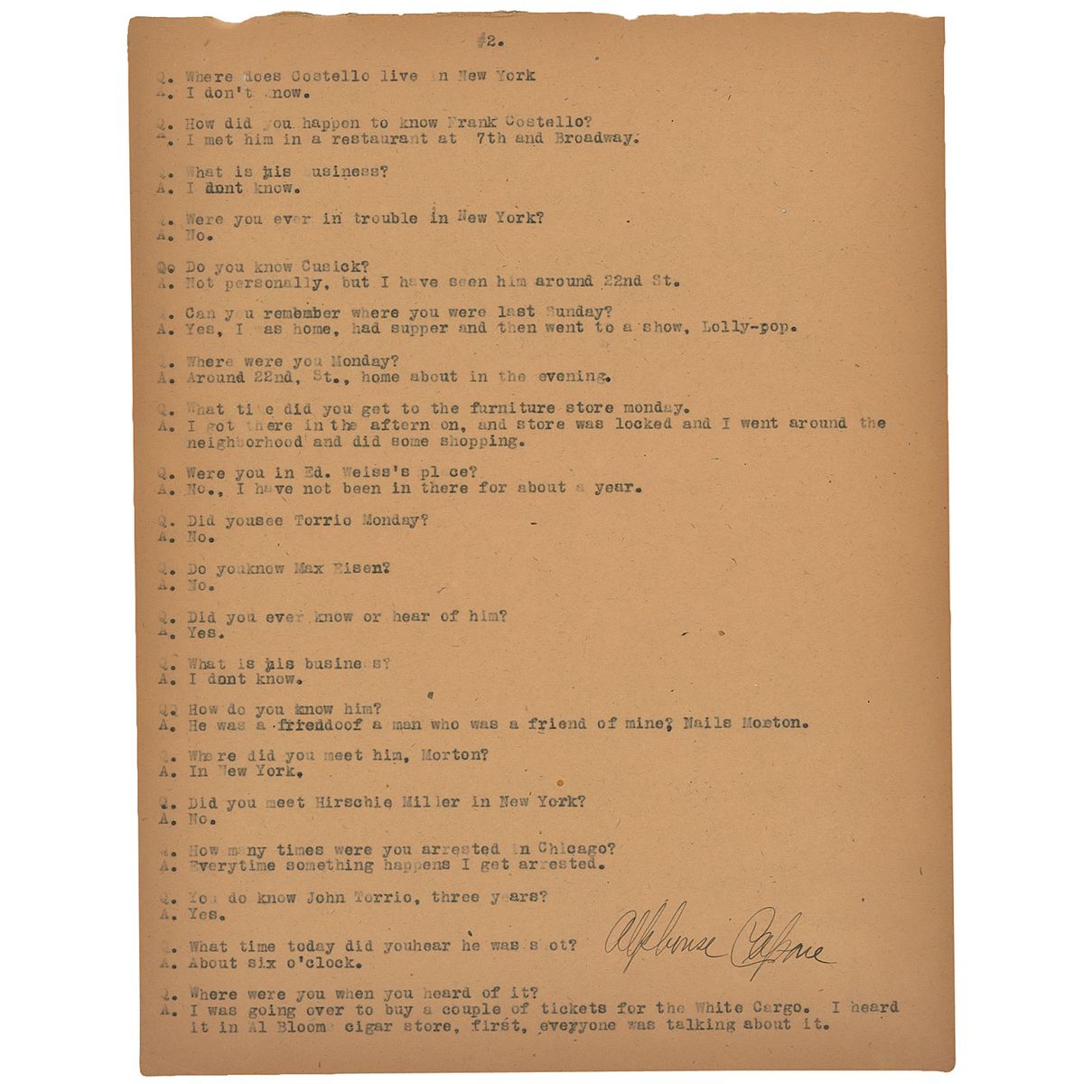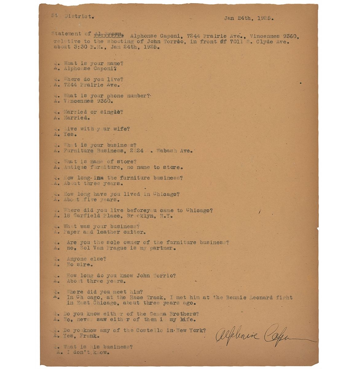 Typed deposition signed an unbelievable four times, "Alphonse Capone,” once on each page of a four-page transcript of Capone's interrogation by police in their investigation of the attempted murder of his former mentor and crime associate John Torrio, dated January 24, 1925. Capone’s deposition is contained within 50 pages of police interviews, testimony, and notes in the case, each signed by the witness, two of whom include Capone's chauffeur, Robert Barton and his accountant, Jake Gusick.