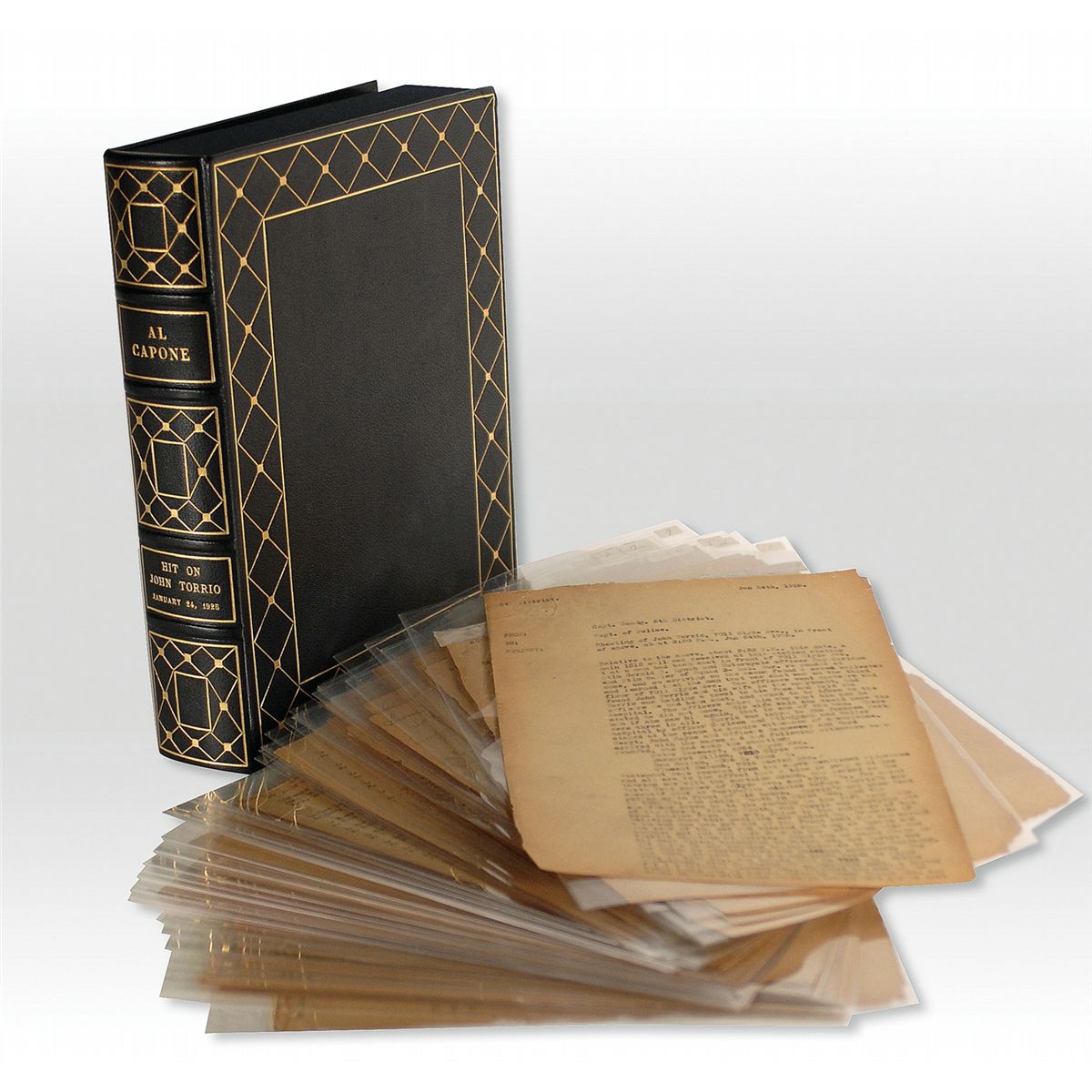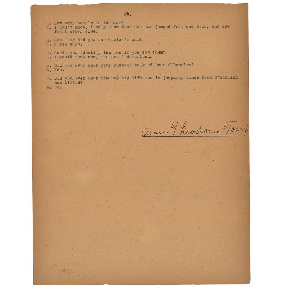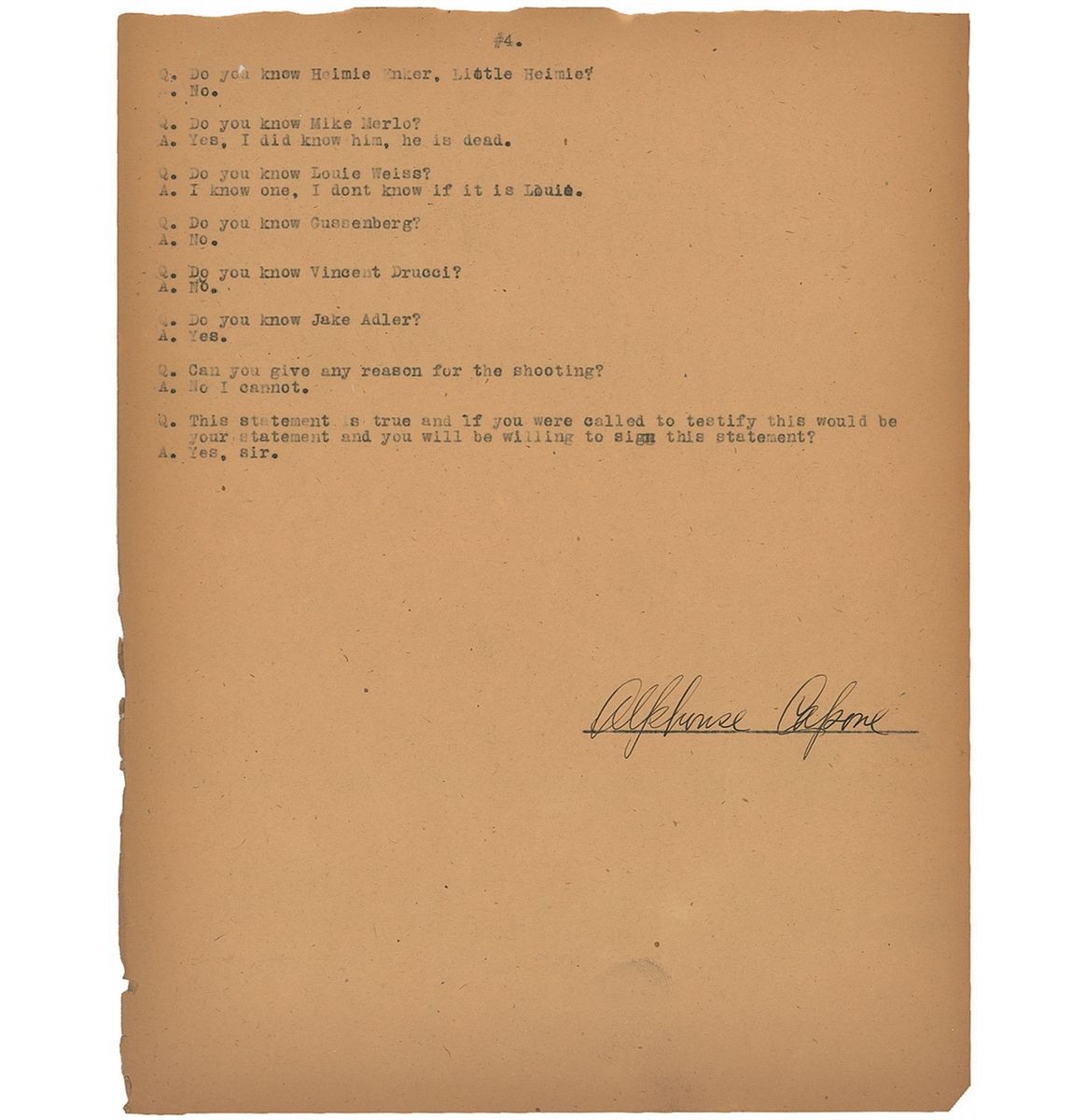 Typed deposition signed an unbelievable four times, "Alphonse Capone,” once on each page of a four-page transcript of Capone's interrogation by police in their investigation of the attempted murder of his former mentor and crime associate John Torrio, dated January 24, 1925. Capone’s deposition is contained within 50 pages of police interviews, testimony, and notes in the case, each signed by the witness, two of whom include Capone's chauffeur, Robert Barton and his accountant, Jake Gusick.