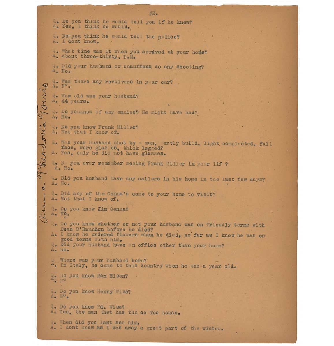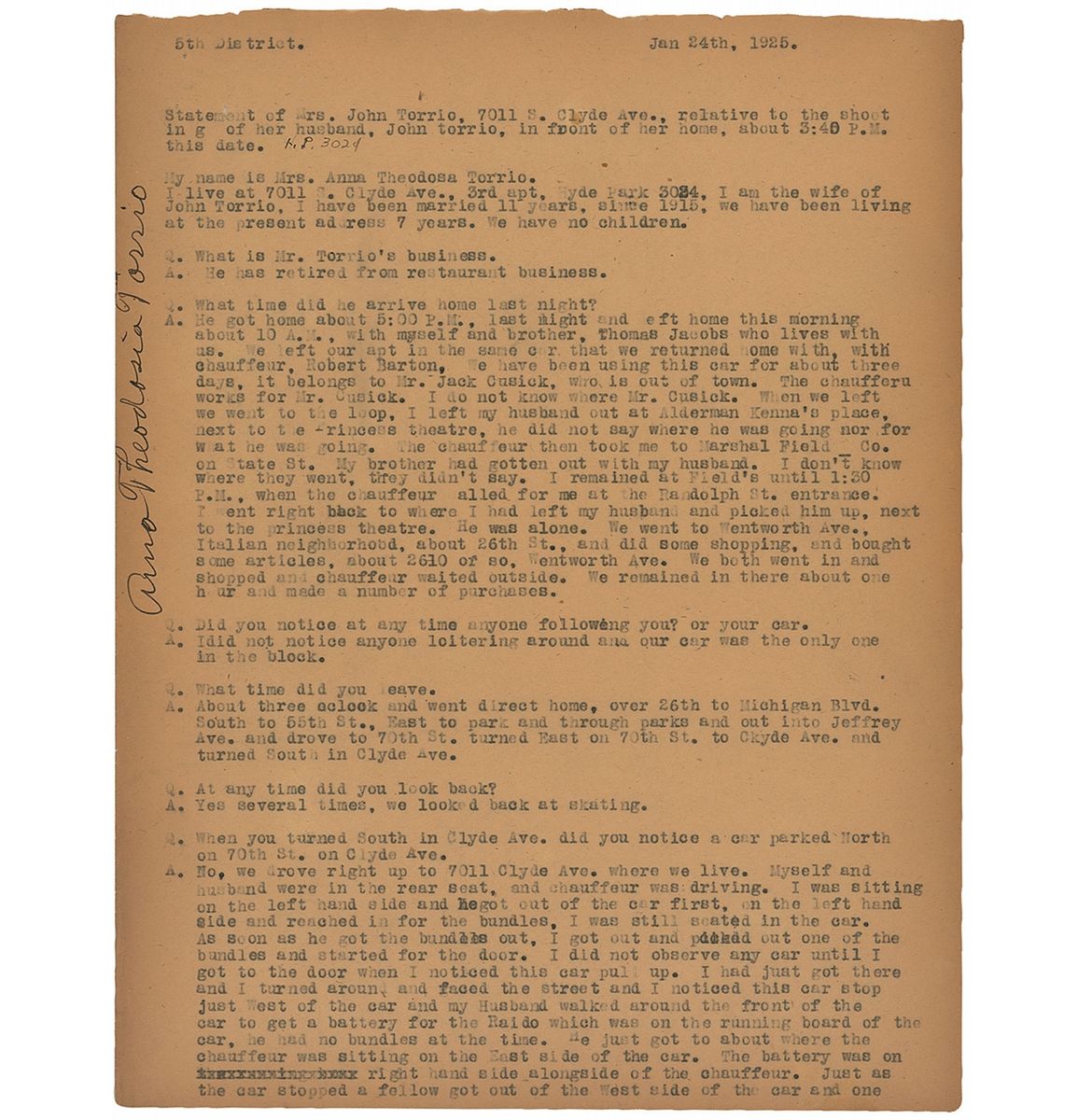 Capone's statement is captioned: "Statement of Alphonse Caponi [sic]. 7244 Prairie Avenue...relative to the shooting of John Torrio...about 3:30 P.M. Jan 24th, 1925." Highlights of the interrogation are as follows: “Q. What is your business? A. Furniture business. 2224 Wabash Ave. Q. What is [the] name of store? A. Antique furniture. No name to store…Q. How long do you know John Torrio? A. About three years. Q. Where did you meet him.? A. In Chicago, at the Race Track, I met him at the Bennie Leonard fight in East Chicago, about three years ago....Q. Do you know any of the Costello in New York? A. Yes, Frank.…Q. How did you happen to know Frank Costello? A. I met him in a restaurant at 7th and Broadway.…Q. Were you ever in trouble in New York? A. No.... Q. How many times were you arrested in Chicago? A. Everytime something happens I get arrested. Q. You do know Johnny Torrio, three years? A. Yes. Q. What time today did you hear he was shot? A. About six o’clock. Q. Where were you when you heard of it? I was going over to buy a couple of tickets for the White Cargo. A. I heard it in Al Bloom’s cigar store, first, everyone was talking about it. Q. What did you do when you heard of it? A. I called the hospital…Q. You got to the room where Torrio was? A. Yes. Q. Did you talk to him in Italian? A. No.…Q. Did he tell you who did it, or did you ask him who did it? A. I did not ask him and he did not tell me because he was in no condition to talk. Q. Would [you] have any idea who did it? A. No. Q. Would you tell us if you did know who did it? A. No, I value my life too much to tell if I did know.... Q. Can you give any reason for the shooting? A. No I cannot. Q. This statement is true and if you were called to testify this would be your statement and you will be willing to sign this statement? A. Yes, sir."