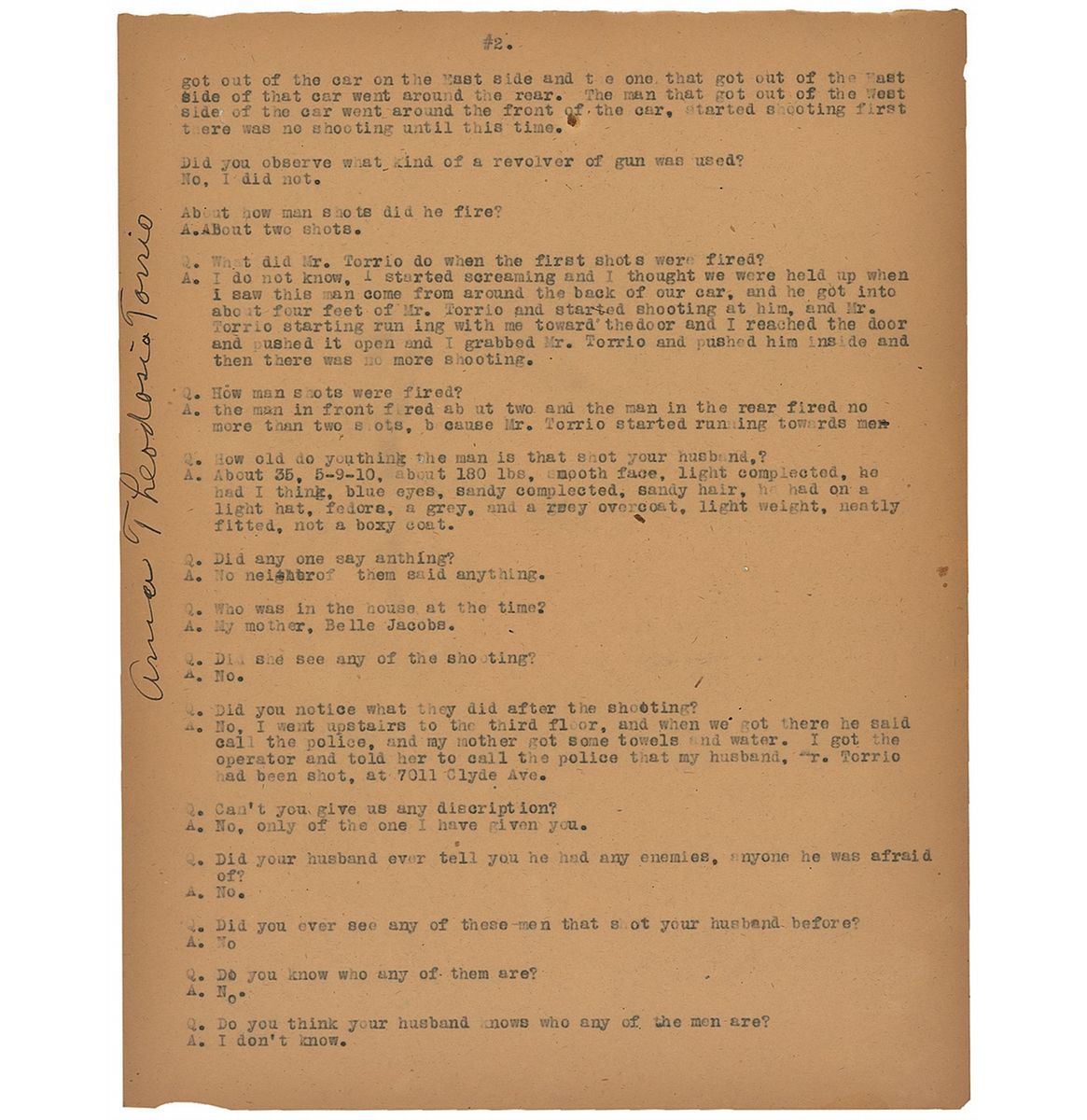 The first page provides the facts surrounding the shooting stating that it took place at 3:30 P.M. at 7011 Clyde Avenue. Page states Torrio had “3 superficial gun shot wounds,” with the cause stating “While alighting from his automobile from the front of the above address was assaulted by three men, two of the men fired several shots at him, causing above injuries. The assailants then jumped into a dark cadillac touring car.” Capone's police interrogation took place the same day as Torrio's near fatal shooting.