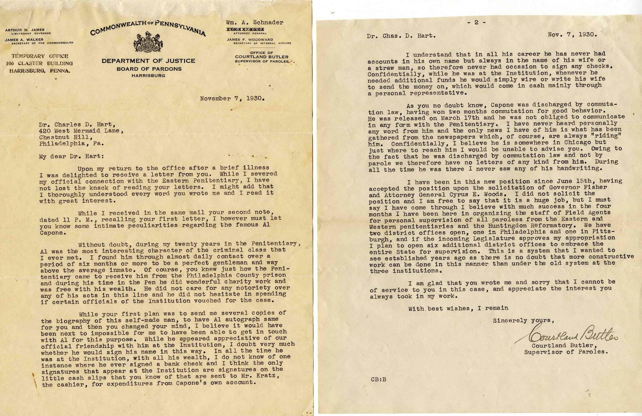 Department of Justice letter discussing Al Capone's time in prison, dated 7 November 1930. Letter is written and signed by Supervisor of Paroles Courtland Butler, who interacted with Capone on a daily basis. Letter declines a friend's request to see if Butler can get an autograph from Capone or knows his whereabouts and reads in part, ''…I found him to be a perfect gentleman and way above the average inmate. Confidentially, I believe he is somewhere in Chicago…'' Letter, measuring 8.5'' x 11'' has toning throughout, otherwise very good.