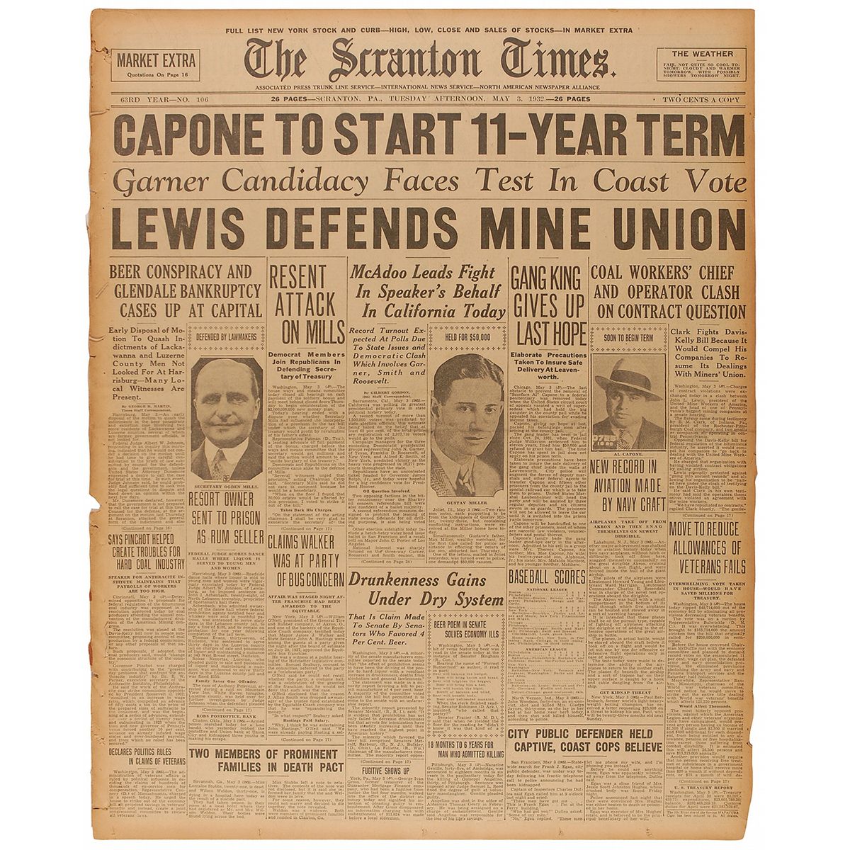 Original May 3, 1932, edition of The Scranton Times, with the banner headline announcing “Capone To Start 11-Year Term.” Single column article’s headline states “Gang King Gives Up Last Hope; Elaborate Precautions Taken to Insure Safe Delivery at Leavenworth,” with a printed mug shot of Capone to right of article. Central horizontal fold, light overall toning, marginal binding holes to left edge and small tears and paper loss to the very fragile edges, otherwise very good condition.