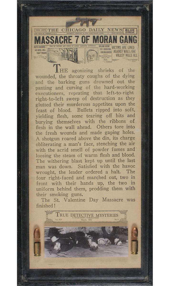 Two bullets and shell casings fired from the ‘Tommy’ guns used in the St. Valentine’s Day Massacre. The two .45 ACP rounds were fired in 2008 by the Quartermaster of the Berrien County Sheriff’s Department and Charles Schauer, a Thompson collector and historian. Rounds are framed against a print with a graphic printed description of the event to an overall size of 9 x 19. Accompanied by a certificate of authenticity from Schauer which states, in part: “This certifies that the .45 caliber ACP bullets and shell casings…were fired from the two Thompson Submachine Guns identified as having been used in the St. Valentine’s Day massacre…The accompanying rounds were fired at the Berrien County Sheriff’s Department Firing Range in Coloma, Michigan on 09 April 2008.” Also accompanied by a typed letter from Schauer stating the bullets were fired into a 55-gallon barrel of water. In fine condition. Intriguing and particularly chilling relics connected to one of the most vicious gangster crimes of all time.