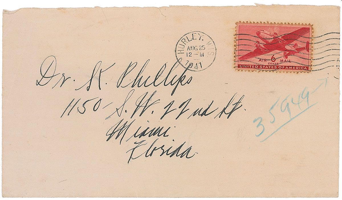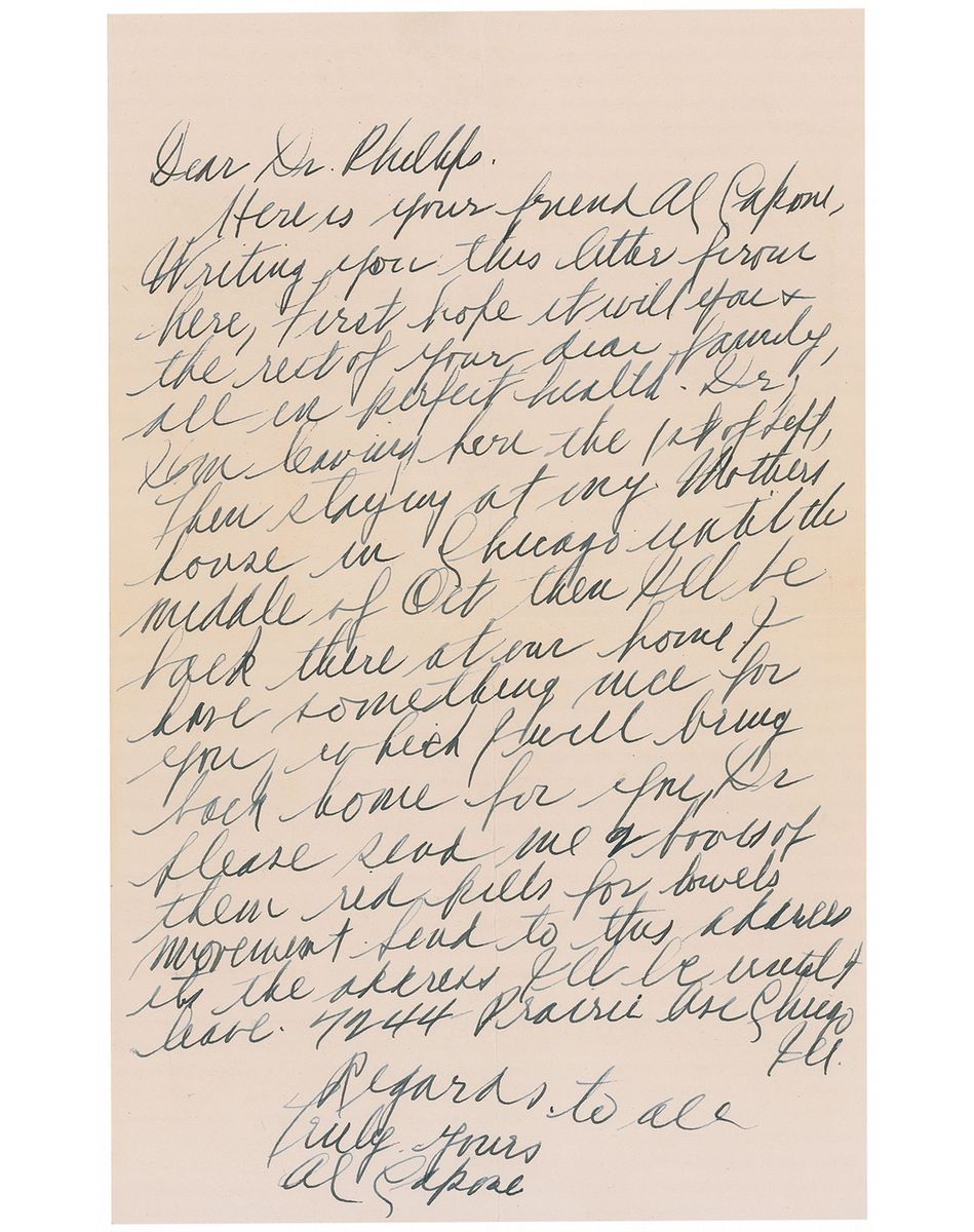 The collection is highlighted by a gorgeously penned, bold ALS, signed “Truly yours, Al Capone,” one page, 6.5 x 10.25, no date, but postmarked August 25, 1941. Capone writes to his beloved family physician, Dr. Phillips, in full: “Here is your friend Al Capone, writing you this letter from here, first hope it will find you & the rest of your dear family all in perfect health. Dr., I’m leaving here the 1st of Sept, then staying at my mother’s house in Chicago until the middle of Oct then I’ll be back there at our home. I have something nice for you which will bring back home for you. Dr. please send me 2 boxes [sic] of them red pills for bowels movement. Send to this address its the address I’ll be until I leave. 7244 Prairie Ave., Chicago, Ill.” Accompanied by the original mailing envelope addressed in Capone’s hand.
