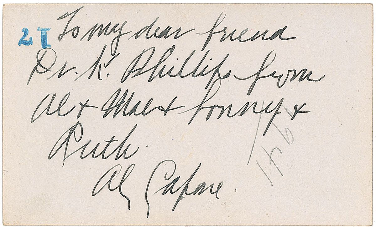 Equally as spectacular is a vintage glossy 4.5 x 2.75 candid photo of Capone, his wife Mae, his son Sonny, and Sonny’s wife Ruth outside his Florida home, signed and inscribed on the reverse, “To my dear friend Dr. K. Phillips from Al & Mae & Sonny & Ruth. Al Capone.”