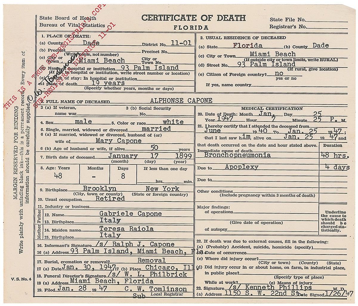 Also included is a true sub-registrar’s copy of Capone’s State of Florida death certificate, 8.5 x 7, with a file date of January 28, 1947. Certificate lists all of Capone’s personal and physical information, his cause of death, “Bronchopneumonia due to Apoplexy,” and listing Kenneth Phillips as his physician.