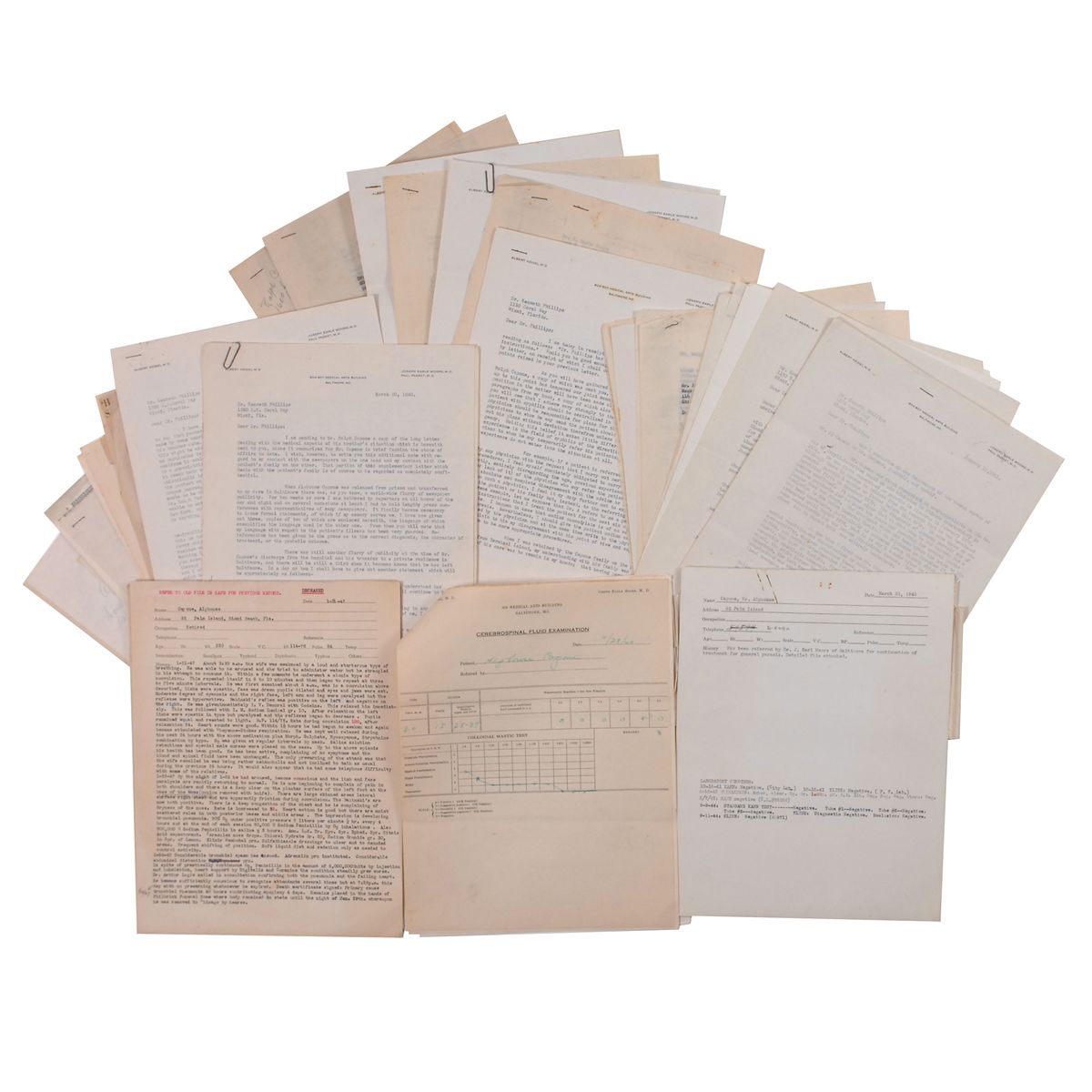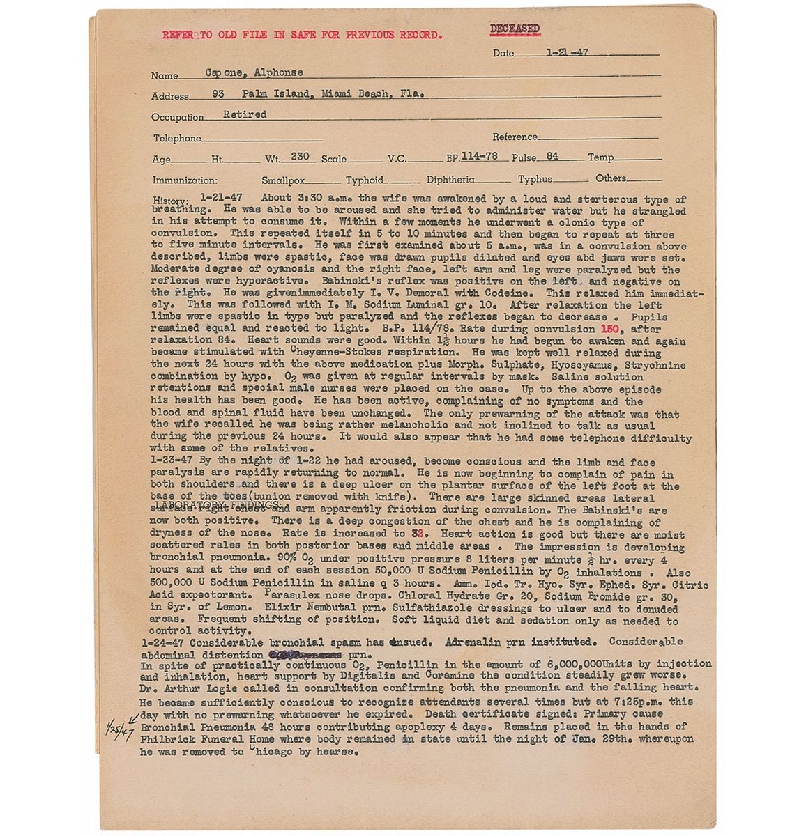 A truly unique and groundbreaking archive spanning Al Capone’s final years from 1939–1947 (his release from prison up until his death), originally belonging to Capone’s Florida doctor Kenneth Phillips. Collection includes an ALS, a signed candid family snapshot, an official copy of Capone’s death certificate, numerous funeral of photos of Capone lying in state (including the original negatives), his medical chart spanning 1940–1943, his medical chart chronicling the final four days of his life, 26 pieces of correspondence related to his neurosyphilis treatment, four press releases, two 1940 eye chart exams, one 1944 lab test, and the Capone Estate bill for his final days of doctor’s care.