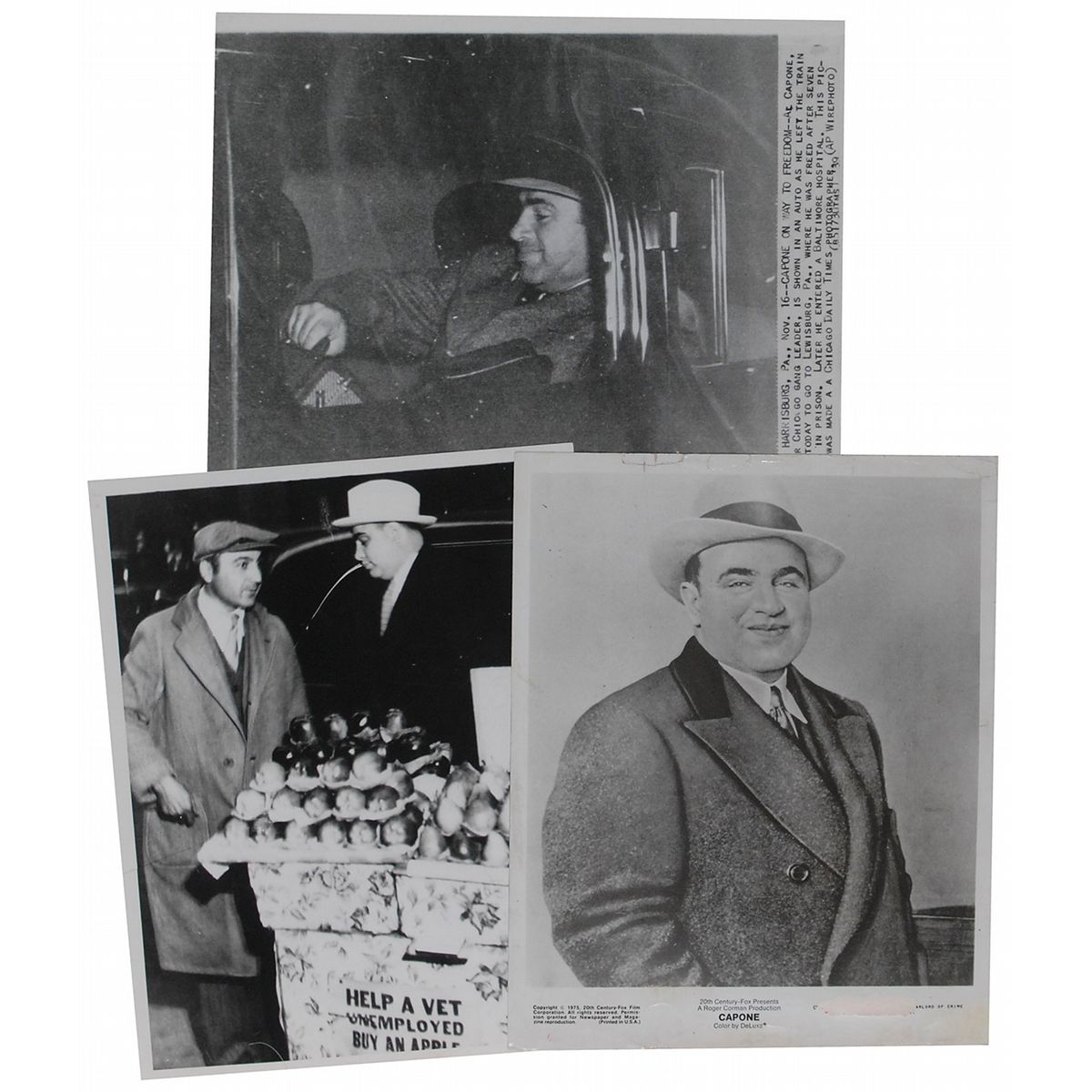 Three original glossy circa 1970s press photos, 10.5 x 8 and 8 x 10, showing Capone near an apple vendor, in a car, and one promotional photo for the 1975 film Capone. In overall fine condition, with scattered creases and normal news use and wear.
