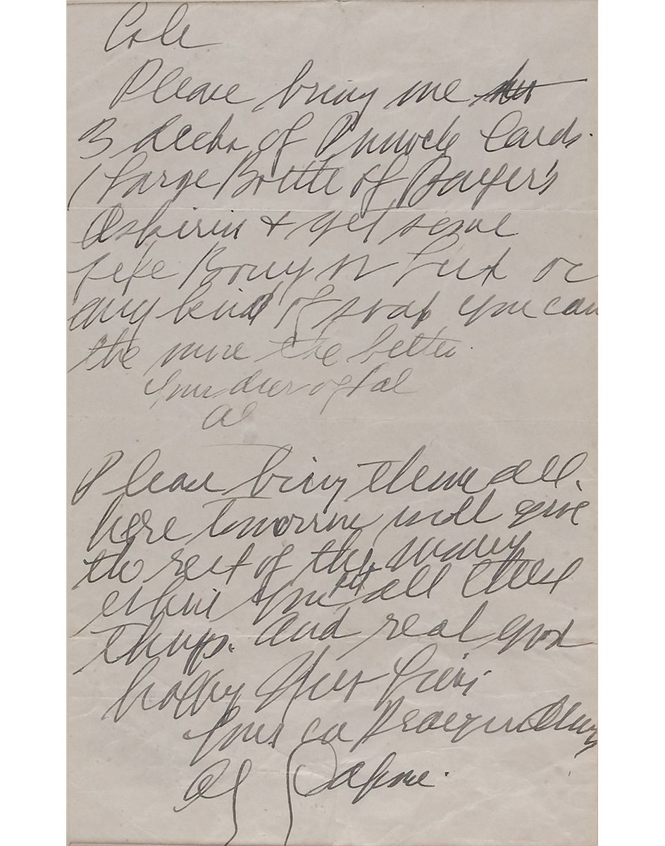 ALS signed twice “Your dear old pal, Al,” and “Al Capone,” one page, 6.5 x 10.5, no date, but mid-1940s. Letter written to family friend Gertrude F. Cole asking her to pick up some items at a store. In full (with grammar and spelling retained): “Please bring me 3 decks of Pennucle Cards, 1 large bottle of Bayer’s Aspirin & get some…Borax or Lux or any kind of soap you can the more the better. Your dear ol pal, Al.” Capone continues underneath, “Please bring them all here tomorrow will give you the rest of the money when you get all these things and real good happy new year,” and signed at the conclusion, “Al Capone.” Simply matted and framed to an overall size of 10 x 14. In very good condition, with intersecting folds, one through a single letter of signature, and moderate overall creasing and wrinkling. All of Capone’s writing remains quite crisp and bold.