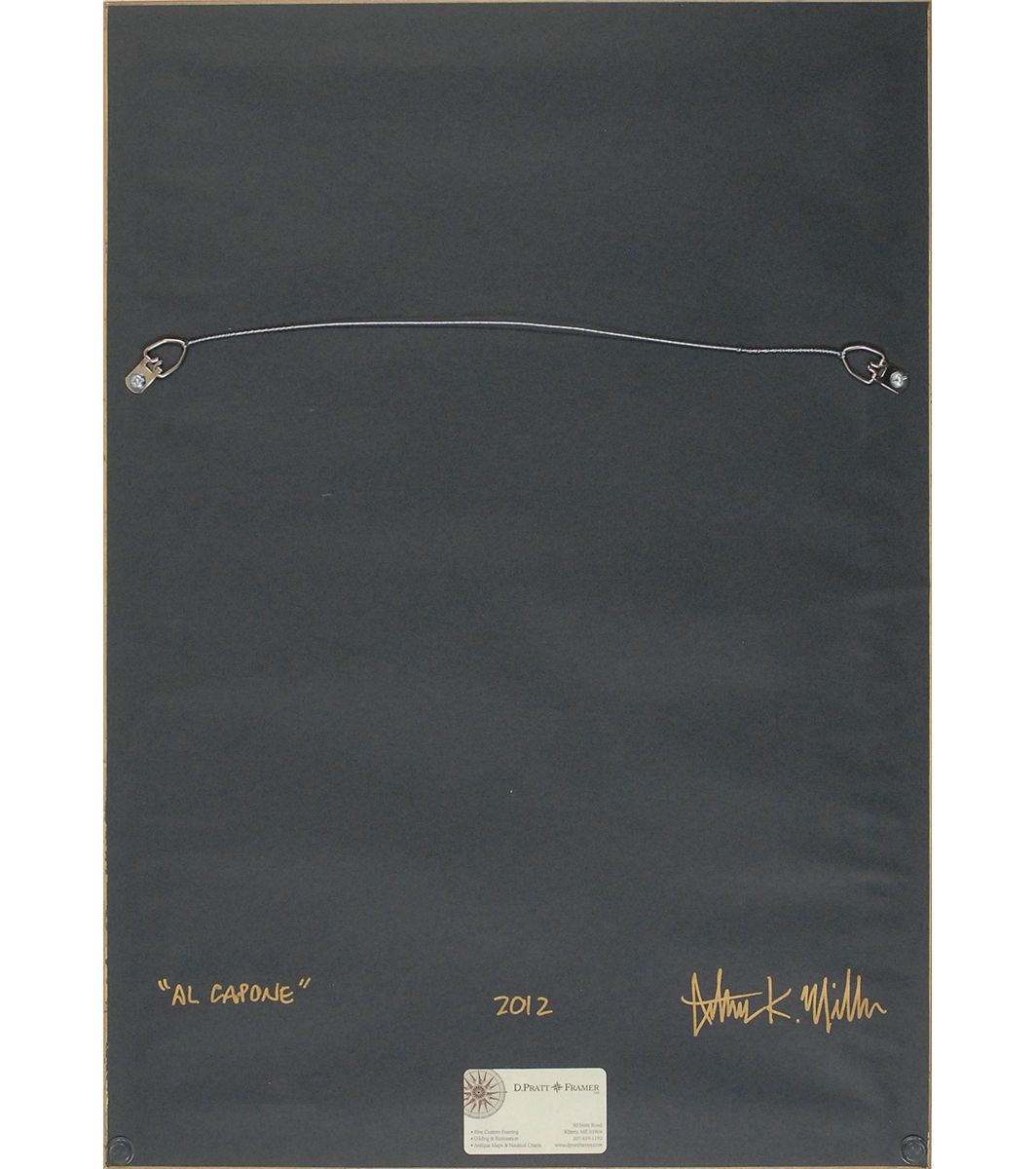 Well-done and impressive original painting entitled ‘Al Capone,’ by artist Arthur K. Miller in 2012, acrylic on Masonite, 11.5 x 17.5, depicting Capone staring out intently from under his gray fedora. Signed in the upper left corner, “M,” and signed on the reverse of the backing of the frame in gold ink, “‘Al Capone,’ Arthur K. Miller, 2012.” Framed to an overall size of 14.5 x 20.5. In very fine condition. An artist from York Beach, Maine, Miller’s acrylic paintings are collected internationally. They have graced the covers of many publications, and some were featured in a one-man show at the National Baseball Hall of Fame for more than five years.