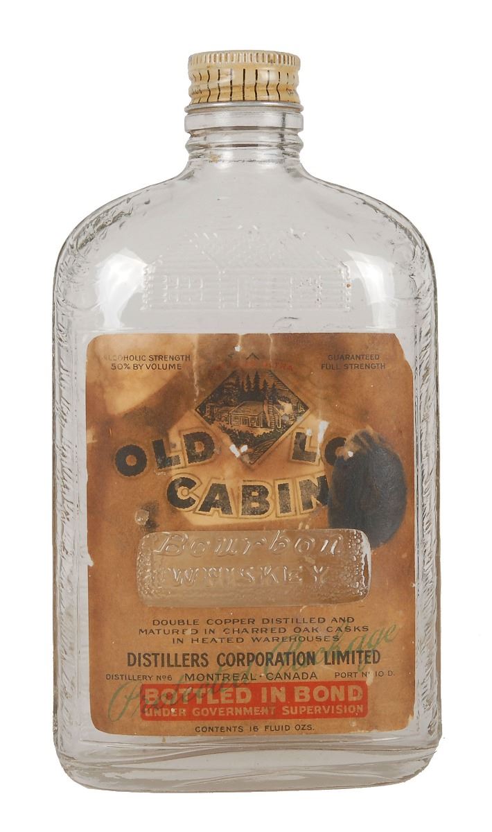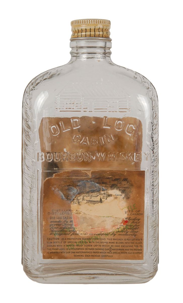Collection of four items related to Capone: a Prohibition–era empty 7.25? tall glass bottle for Old Log Cabin bourbon whiskey, which was one of the primary whiskeys Capone and his gang imported from Canada for resale; a Prohibition–era cardstock ad for Al Capone’s beer delivery front Cicero Bottling Works, 18 x 4, which would have been used in sign frames inside subways and buses around Chicago; a National Prohibition Act prescription document for alcohol dated April 1928; and a glossy 1947 press photo of Capone. In overall very good to fine condition.