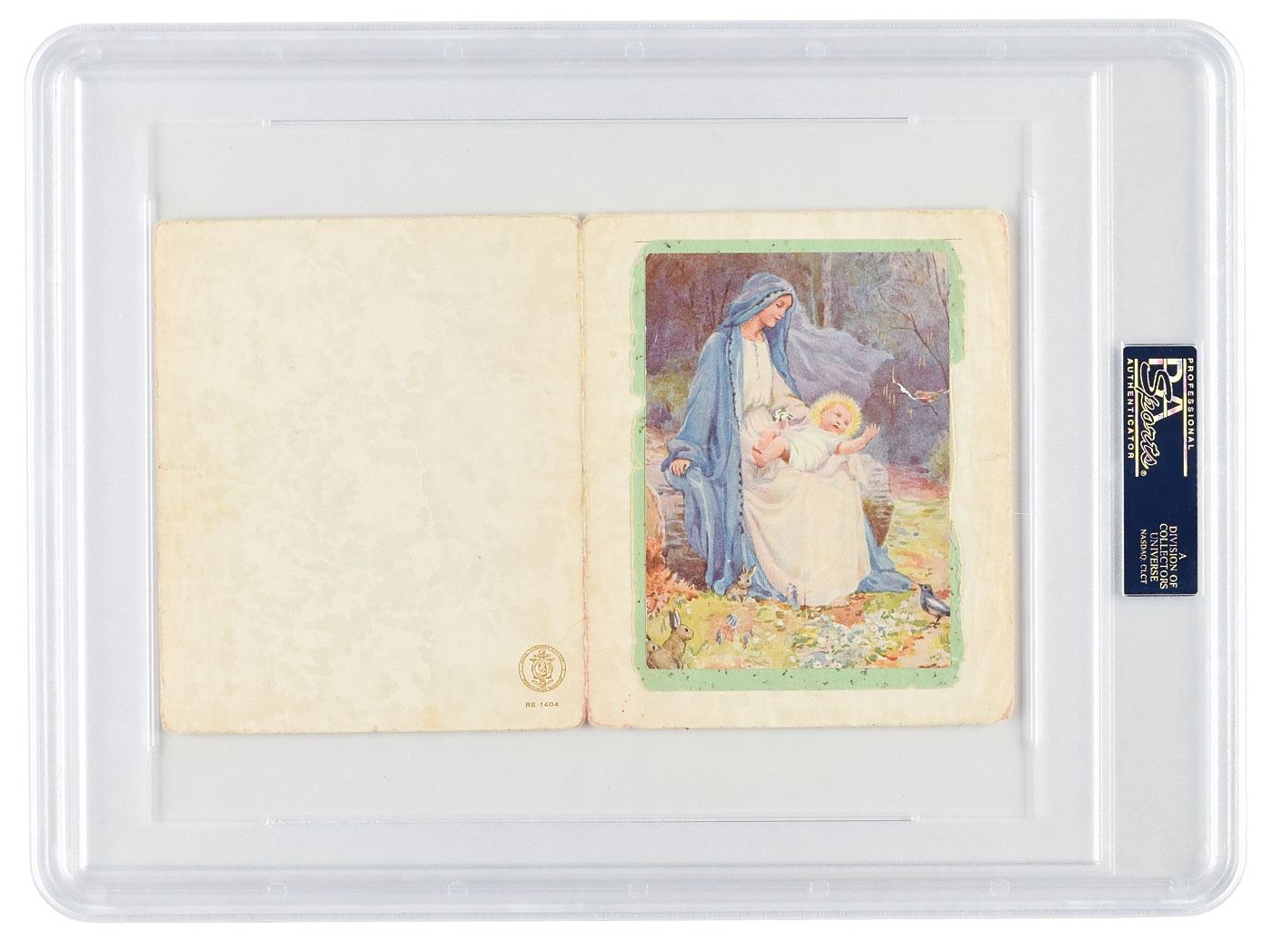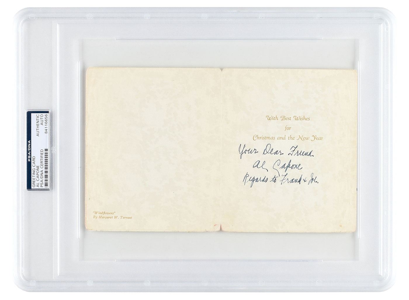 Exceedingly rare Christmas and New Year's card, measuring 9.25 x 5.5 open, signed and inscribed inside, "Your Dear Friend, Al Capone, Regards to Frank & Joe." The front of the card features a serene artistic portrait of the Virgin Mary cradling baby Jesus in a meadow, credited on the inside as 'Windflowers' by Margaret W. Tarrant. Encapsulated in a PSA/DNA authentication holder. In very good to fine condition, with light overall creasing and handling wear.