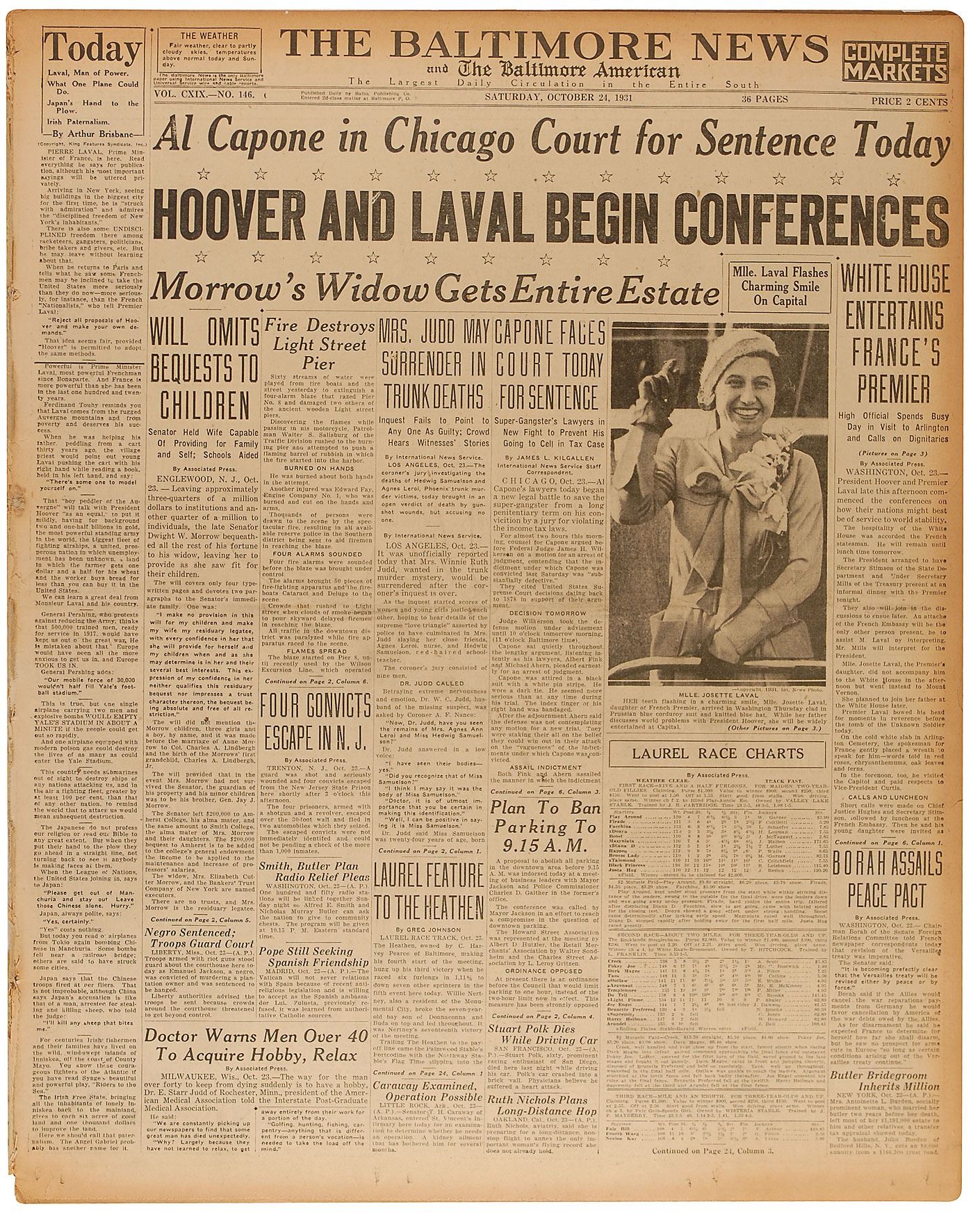 Original October 24, 1931, edition of The Baltimore News, 17 x 21, 36 pages, with the banner reading "Al Capone in Chicago Court for Sentence Today," with a one column article's headline stating "Capone Faces Court Today For Sentence. Super-Gangster's Lawyers in New Fight to Prevent His Going to Cell in Tax Case." In good to very good condition, with central horizontal fold, mild toning, heavier to edges, and some chips to the very fragile edges.