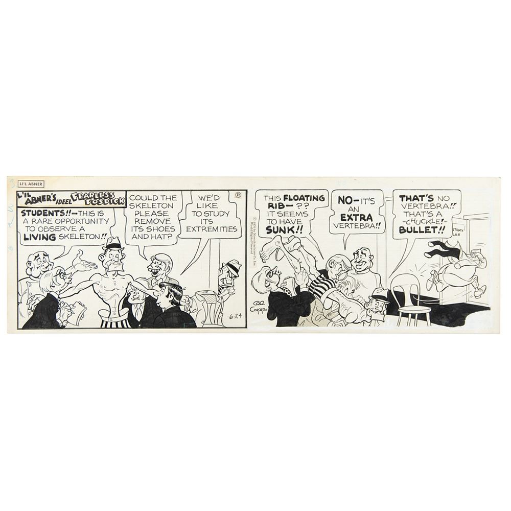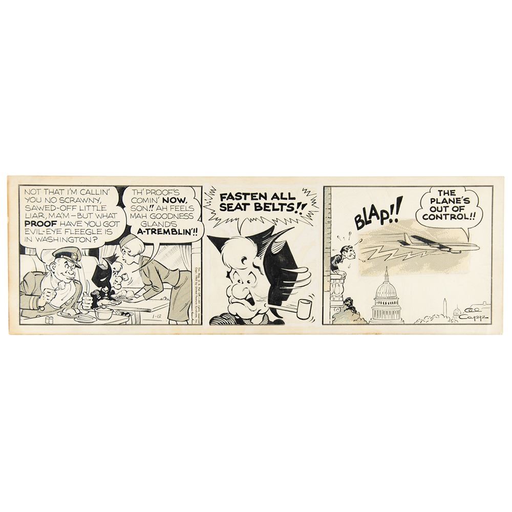 Attractive grouping of four Li'l Abner original artwork pieces by legendary cartoonist Al Capp, consisting of three original hand-drawn Li'l Abner comic strips dating to three different decades, and a large ink and graphite sketch of Li'l Abner Yokum, accomplished on an off-white 6.5 x 10.25 sheet of clipped cardstock, depicting the brawny hillbilly as a bellhop happily carrying four suitcases, signed boldly below by Capp. The three comic strips, rendered in ink and graphite, range in size from 19.75 x 6.25 to 22.75 x 6.25 and are each signed in the last panel in black ink by Capp. The comic strips feature L’il Abner observing a miraculous gambling situation (August 19, 1941), Mammy Yokum on a turbulent plane trip caused by Evil Eye Fleagle (January 12, 1962), and a “Li'l Abner's ‘Ideel’ Fearless Fosdick†comic that shows the Dick Tracy parody character having his clothes stolen during an anatomy lab class (June 24, 1970). Each bears an affixed New Service or United Feature Syndicate copyright label. The 1941 comic strip is affixed to a 24 x 7.5 cardstock mount, and the reverse of the 1970 comic bears a “Photostat†stamp. In overall fine condition.