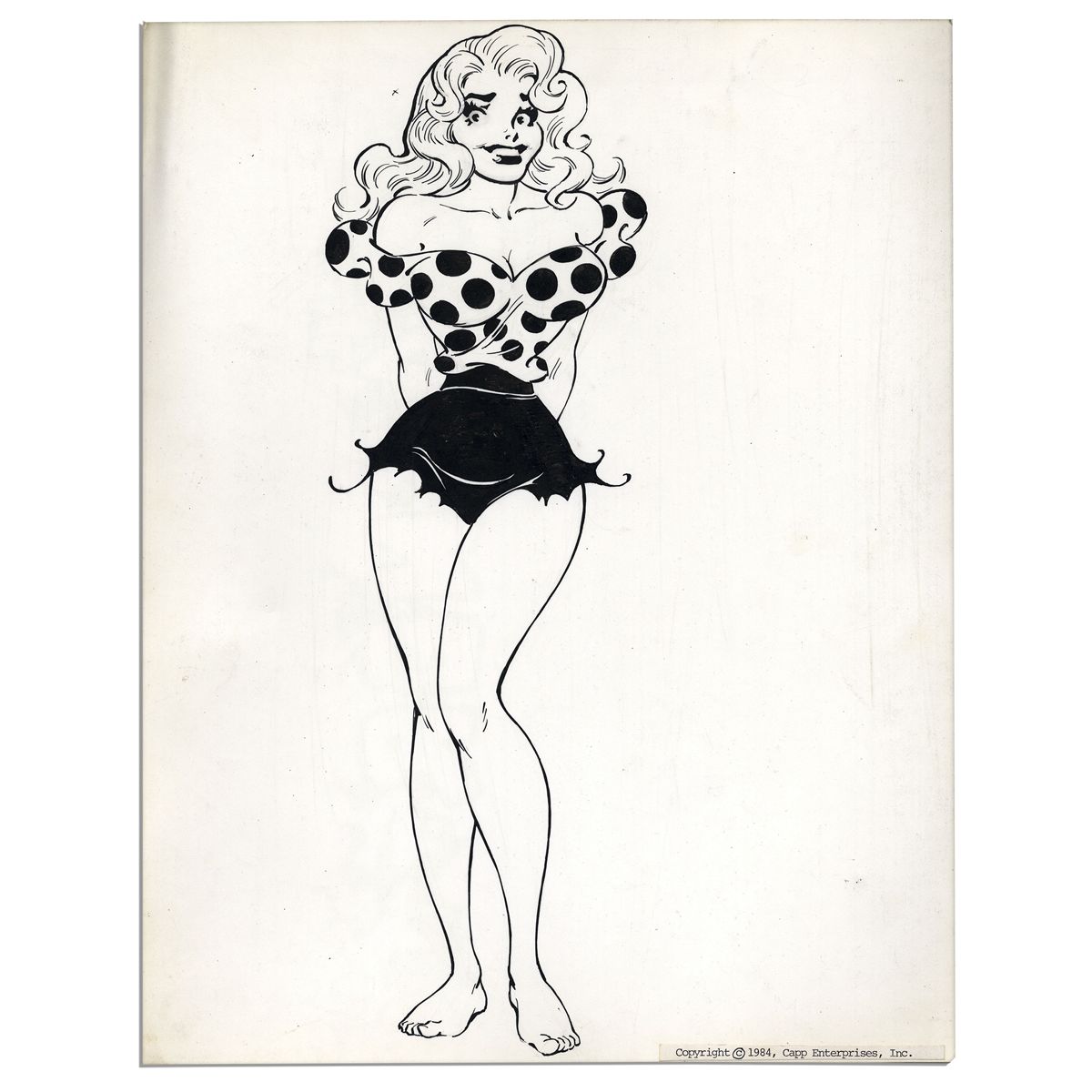 Al Capp drawing of ''Li'l Abner'' star Daisy Mae. Large ink drawing of the barefoot cartoon bombshell measures 11.5'' x 14.5''. Partial ''Li'l Abner'' Sunday strip header is printed to verso. Two pinholes to lower right quadrant. Near fine.