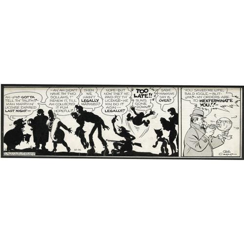 <B>Al Capp Studio - Li'l Abner Daily Comic Strip Original Art, dated 12-14-55 (United Features Syndicate, 1955).</B></I> Marryin' Sam's license to wed has expired, so Tiny Yokum, Li'l Abner's brother, narrowly escapes marriage on Sadie Hawkins Day. Meanwhile, the Bald Iggle faces imminent execution. The image area of this daily measures 5.5" x 19". There are very minor residue areas in panel one, possibly left by Zipatone film that has slipped off; otherwise the condition of the art is Excellent. Here's a chance to own a delightful Dogpatch daily featuring Sadie Hawkins Day!