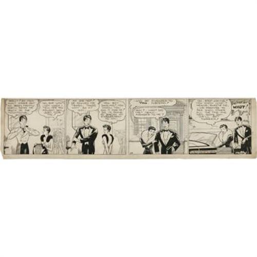 <B>Al Capp - Li'l Abner Daily Comic Strip Original Art (United Feature Syndicate, 1934).</B></I> Even though he looks a bit different, he's still the same ol' Li'l Abner, Although this strip is dated 1936 in its copyright notice, it's actually the 23rd episode and hails from 1934. Also, take note, the strip is signed Al G. Cap rather than Al Capp. Here's a chance to own an early example from the strip's first year. The image area measures approximately 22" x 5", and is in Excellent condition.<BR><BR><b>Shipping:</b> Flat Material, Small (<a target="_blank" href="http://www.heritageauctions.com/common/shipping.php">view shipping information</a>)