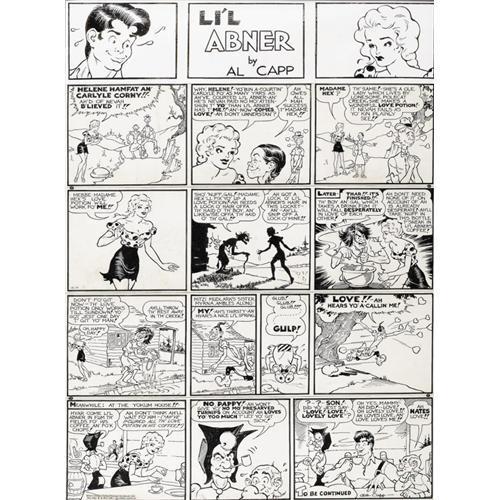 <B>Al Capp Studio - Li'l Abner Sunday Comic Strip Original Art, dated 12-17-39 (United Features Syndicate, 1939).</B></I> Daisy Mae's plot to spike Li'l Abner's coffee with Madame Hex's potent love potion is about to go comically awry. Among Capp's many fans was author John Steinbeck, who cited Al Capp as "the best writer in the world." This superb early Sunday, from the feature regarded by many as the greatest comic strip of all time, has an image area of approximately 19" x 26". The title logo in the top tier is a replacement, the strip was cut between each panel tier and later rejoined; otherwise, the art is in Excellent condition. This strip has been professionally framed, and is sure to make a wonderful showpiece for any <I>Li'l Abner</B></I> fan.