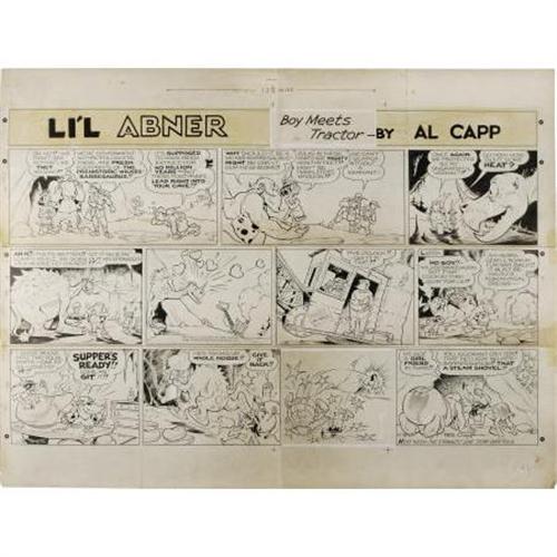<B>Al Capp - Li'l Abner Sunday Comic Strip Original Art, dated 10-20-57 (United Features Syndicate, 1957).</B></I> The Wilkes-Barresaurus takes center stage in this satirical sensation and Hairless Joe and Lonesome Polecat co-star. This strip hails from the years that Frank Frazetta was assisting on Li’l Abner. The image area of this Sunday measures approximately 27.5" x 18". Each of the three panel tiers and several of the individual panels were cut apart, and later rejoined. There is also a fold through the center of the strip; otherwise, the art is in Good condition.<BR><BR><b>Shipping:</b> Flat Material, Large (<a target="_blank" href="http://www.heritageauctions.com/common/shipping.php">view shipping information</a>)