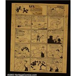Al Capp - Original Comic Strip Art for Li'l Abner (United Features Syndicate, 1938). Al Capp created this classic hillbilly strip in 1934 and it quickly became one of America's favorites, a popularity that would last for decades. It was such a cultural phenomenon that it eventually spun off into plays, movies, and more merchandising than you could shake a Shmoo at. Al Capp's political views later on entered the strip, as in this Sunday page were we see the lovable Li'l Abner tangling with a ruffian and coming out on top, showing us that violence is not the solution to all conflict. The story behind this strip is legendary: Al Capp worked as an assistant to Ham Fisher, the creator of Joe Palooka, wherein he introduced a hillbilly character named Big Leviticus. When working conditions in Fisher's studio became intolerable, Capp left, taking his hillbilly with him and eventually using the concept as the springboard for Li'l Abner. This began a feud that would last as long as Capp and Fisher lived, a feud which comes to life in this strip. The boxer character is Capp's parody of Joe Palooka (notice how Abner knocks him flat without even trying), and the manager is a caricature of Fisher. All in all, a rather pointed barb. These strips are very desirable and highly sought after by collectors, especially early examples such as this one. This Sunday page is in very good condition with minor amounts of white-out and light staining and measures 19"x 26" overall. Important notice: We expect to be auctioning lots at the rate of 200-250 per hour. Sometimes eBay Premier live bid software cannot keep up with that pace, so we strongly recommend that you place a realistic proxy bid now as insurance to avoid disappointment. Also please note that all Heritage/CAA lots purchased through eBay Premier carry a 20% Buyer's Premium.