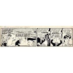 Al Capp - Original Comic Strip Art for Li'l Abner (United Features Syndicate, 1944). Once again, Abner's favorite cartoon gumshoe, Fearless Fosdick is in deep trouble, as the evil Rat Top has him chained up and is draining his blood. Fosdick (by "Lester Gooch") was Capp's long-running and good-natured satire of Chester Gould's famous Dick Tracy, and in fact the strip-within-a-strip format became so useful to Capp that he used it throughout the strip's run. This wonderful daily is a classic Fosdick piece, with three great shots of Rat Top bookended by terrific portraits of Abner and Daisy Mae. This piece is in excellent condition, with some light soiling at the top, but no creases or tears and an overall size of approximately 6 3/4" x 22 1/2". From the collection of Russ Cochran. Important notice: We expect to be auctioning lots at the rate of 200-250 per hour. Sometimes eBay Premier live bid software cannot keep up with that pace, so we strongly recommend that you place a realistic proxy bid now as insurance to avoid disappointment. Also please note that all Heritage/CAA lots purchased through eBay Premier carry a 20% Buyer's Premium.