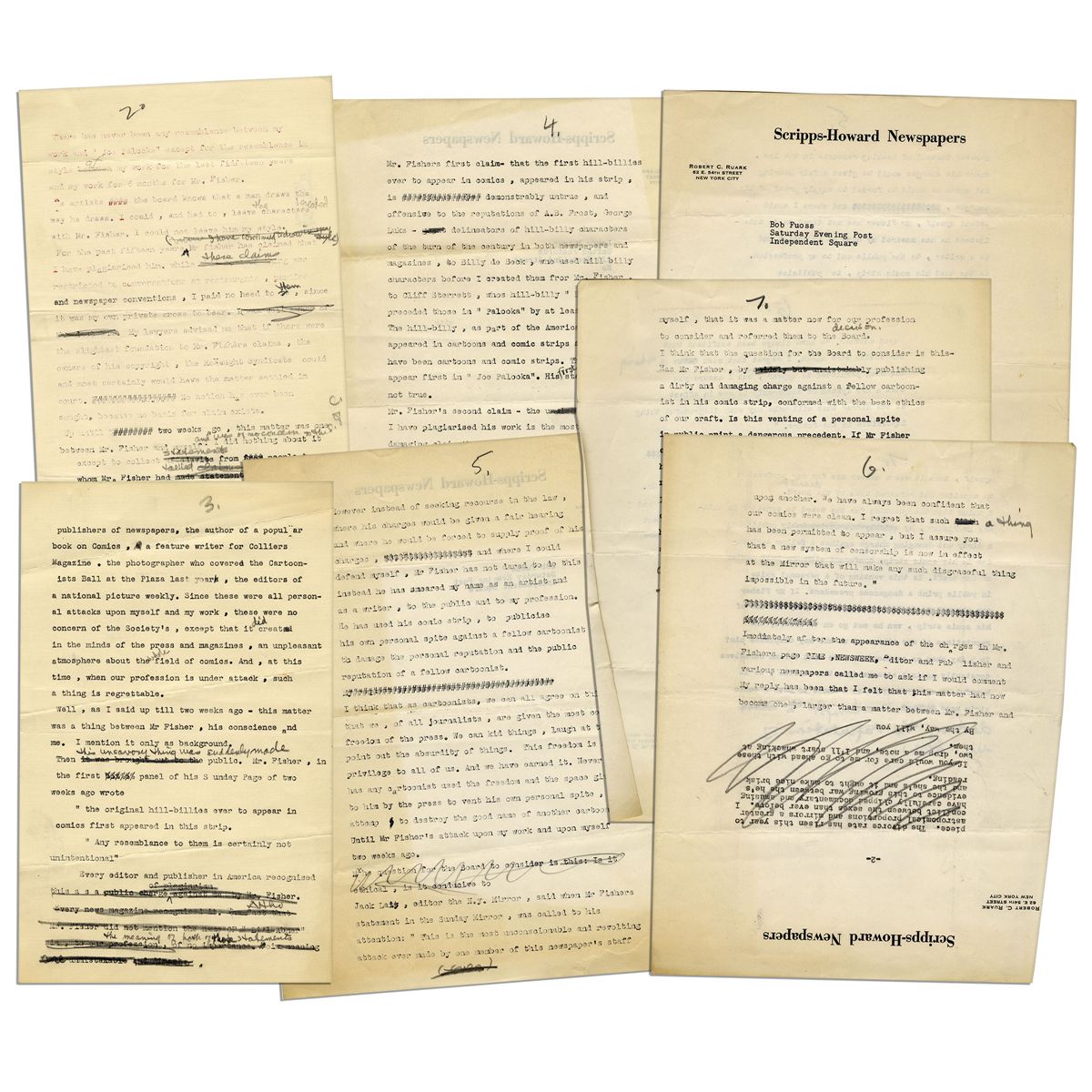 Al Capp typed document with his handwritten corrections. Passionate text defends Capp from attacks by his cartoonist nemesis Ham Fisher, under whom Capp started as an assistant/ghost illustrator on Fisher's popular ''Joe Palooka'' strip. When Capp struck out on his own with ''Li'l Abner'', Fisher claimed the idea of comedic hillbillies had been his. The twenty-year feud resulted in Fisher's expulsion from the National Cartoonists Society for inappropriate conduct. Document reads in part, ''…the board knows that a man draws the way he draws…For the past fifteen years Mr. Fisher has claimed that I have plagiarized him…up till two weeks ago - this matter was a thing between Mr fisher, his conscience and me…Then this unsavory thing was suddenly made public. Mr. Fisher, in the first panel of his Sunday Page of two weeks ago wrote, 'the original hill-billies ever to appear in comics first appeared in this strip.'…Every editor and publisher in America recognized this as a public charge against me…Fisher's claim that the first hill-billies ever to appear in comics appeared in his strip is demonstrably untrue, and offensive to the reputations of A.B. Frost, George Luks - delineators of hill-billy charactersof the turn of the century in both newspapers and magazines, to Billy de Beck, whos [sic] hill-billy 'Hermie the Mermit' preceded those in 'Palooka' by at least a decade. The hill-billy [is] part of the American scene…Never has any cartoonist used the freedom and the space given him by the press to vent his own personal spite…'' Rant runs 6pp. on 5 sheets of different sizes ranging from 6.5'' x 10'' to 8.5'' x 11''. Toning and creasing, with some fading to type, else near fine.