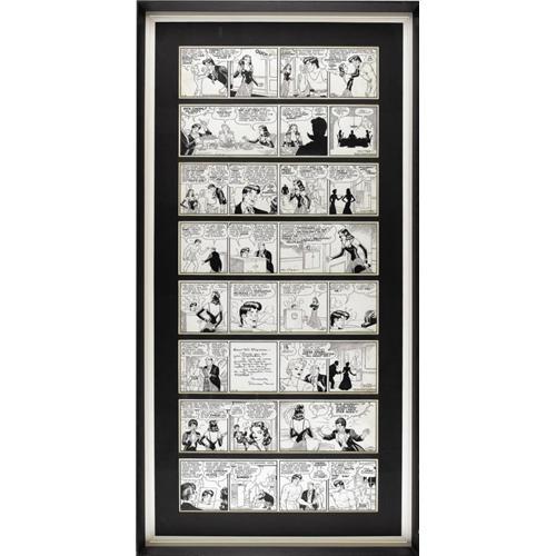<B>Al Capp Studio - Comic Strip Original Art, Group of 8 (United Feature Syndicate, 1941).</B></I> Got a large wall space that needs filling? You need this huge grouping of sequential <I>Li'l Abner</B></I> dailies, dated from Monday, 11-14 to Tuesday, 12-2-41. In this mini-episode, Abner visits his wealthy, uptown Aunt Bessie Bopshire's servant-surfeited mansion, where he meets Her Royal Highness, the Princess No-No. She takes a rather special interest in the young hillbilly's physique, smooth skin, and taught flesh -- but for a reason <I>no one</B></I> suspects! Finding another complete sequence of prime <I>Li'l Abner</B></I> dailies like this would takes years of searching! All eight 22.25" x 5.75 ink on board strips have been matted together and framed to an overall size of 31.75" x 62.75", and all are in Excellent condition. <I>From the Estate of Bruce Hamilton</B></I>. <BR><BR><B>Important notice:</B> Heritage usually auctions material at the rate of 200-250 lots per hour. On some occasions eBay Live bid software or the Internet may not be able to keep up with the pace of the auction. We recommend placing a realistic absentee bid now as insurance to avoid disappointment. Occasionally the auctioneer may eliminate or reject an eBay Live bid, and the auctioneer may also reopen a lot after the close of the eBay live bidding (usually because we missed an audience bid), and may reject your bid even if it shows you as the winning bidder. By bidding via eBay Live, you agree that Heritage may award the lot to another bidder at its sole discretion under the circumstances described above or any other reasonable circumstances. Since eBay bids are not shown to us until we open the lot on the floor, we treat those bids just like floor bids. In most cases the floor responds before the eBay bid is presented to us, due to Internet lag time, so for consistency we have made it a policy that floor bids are always considered first over tie eBay live bids. Also please note that all Heritage lots purchased through eBay Live carry a 22.5% Buyer's Premium. Please make sure you read the Terms and Conditions before you bid. This lot is being auctioned in conjunction with a live floor auction by Heritage Auction Galleries. All final auction and invoice information will be supplied by Heritage Auction Galleries, and all other information should be considered preliminary. Lot:41001 <BR><BR><B>Winning Notification and Billing:</B> After the FINAL session in this auction is complete, Heritage will send e-mail and snail mail invoices. This process normally takes several days. All final auction and invoice information will be supplied by Heritage Auction Galleries, and all other information should be considered preliminary. <BR><BR>This auction will be conducted on a live auction floor and over the Internet through eBay Live. If you choose to place an absentee bid, please take a moment to <font color='#0000ff'><u><a href='http://pages.ebay.com/liveauctions/help/before/laabsentee.html'>learn how eBay Live absentee bidding works</a></u></font><font color='#000000'>