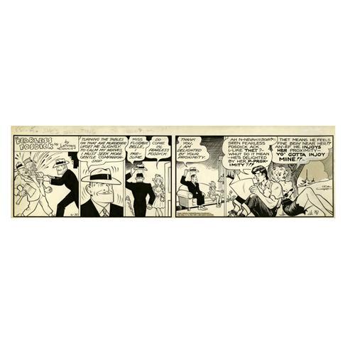 <B>Al Capp Studio - L'il Abner Daily Comic Strip Original Art, dated 6-30-44 (United Feature Syndicate,1944).</B></I> This dauntless daily spotlights Al Capp's satirical spin on <I>Dick Tracy</B></I>, in the person of that top-cop, Fearless Fosdick. In a rather gruesome scene, Fearless poleaxes an axe-murderer. Once Fosdick's policework is done, he cools his heels at the home of his gal-pal, Floosie Belle. Li'l Abner and Daisy Mae cameo in the final panel. This terrific daily has an image area that measures approximately 22" x 5.75" and the art is in Excellent condition.