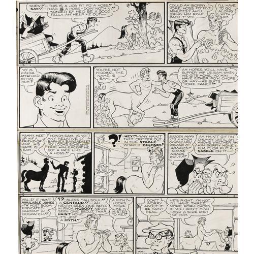 <B>Al Capp Studio - L'il Abner Sunday Comic Strip Original Art, dated 4-30-50 (United Feature Syndicate, 1950).</B></I> He's not a myth, he's a mister! Pappy's none too thrilled to have Abner's new four-legged centaur friend, Sam, stomping around in the house, in this sassy Sunday. Each tier was cut between the borders and then later rejoined using tape, and the pieces have since come loose. The conjoined image area measures 19" x 22". There are tape residue stains on the front of the paper, outside of the image area, and a tape stain along the top of the third tier which carries all the way across the art; otherwise the condition is Good. <BR><BR><B>Important notice:</B> Heritage usually auctions material at the rate of 200-250 lots per hour. On some occasions eBay Live bid software or the Internet may not be able to keep up with the pace of the auction. We recommend placing a realistic absentee bid now as insurance to avoid disappointment. Occasionally the auctioneer may eliminate or reject an eBay Live bid, and the auctioneer may also reopen a lot after the close of the eBay live bidding (usually because we missed an audience bid), and may reject your bid even if it shows you as the winning bidder. By bidding via eBay Live, you agree that Heritage may award the lot to another bidder at its sole discretion under the circumstances described above or any other reasonable circumstances. Since eBay bids are not shown to us until we open the lot on the floor, we treat those bids just like floor bids. In most cases the floor responds before the eBay bid is presented to us, due to Internet lag time, so for consistency we have made it a policy that floor bids are always considered first over tie eBay live bids. Also please note that all Heritage lots purchased through eBay Live carry a 22.5% Buyer's Premium. Please make sure you read the Terms and Conditions before you bid. This lot is being auctioned in conjunction with a live floor auction by Heritage Auction Galleries. All final auction and invoice information will be supplied by Heritage Auction Galleries, and all other information should be considered preliminary. Lot:41001 <BR><BR><B>Winning Notification and Billing:</B> After the FINAL session in this auction is complete, Heritage will send e-mail and snail mail invoices. This process normally takes several days. All final auction and invoice information will be supplied by Heritage Auction Galleries, and all other information should be considered preliminary. <BR><BR>This auction will be conducted on a live auction floor and over the Internet through eBay Live. If you choose to place an absentee bid, please take a moment to <font color='#0000ff'><u><a href='http://pages.ebay.com/liveauctions/help/before/laabsentee.html'>learn how eBay Live absentee bidding works</a></u></font><font color='#000000'>