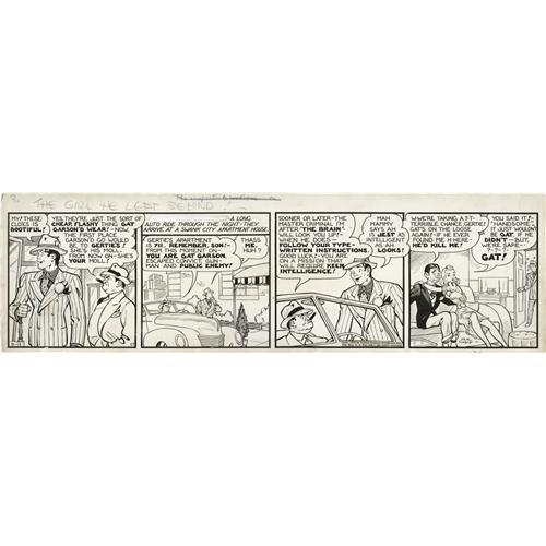 "<B>Al Capp Studio - Li'l Abner Daily Comic Strip Original Art, dated 9-13-39 (United Feature Syndicate, 1939).</B></I> In this beautifully drawn daily, Li'l Abner (who it seems is a look-alike for gangster Gat Garson) goes on an undercover stake-out for the F.B.I. Panel four features the kind of smokin' hot, spicy ""good girl"" art that Capp became infamous for -- <I>hey, now>Q! The image area of this superb daily measures 22"" x 5.75"", and the art is in Excellent condition. "