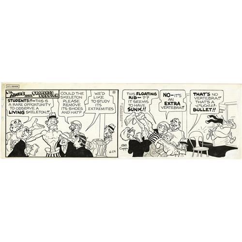 <B>Al Capp Studio - Li'l Abner Daily Comic Strip Original Art, dated 6-24-70 (News Syndicate, 1970).</B></I> That's not an extra vertebra, it's a (chuckle) bullet! Medical students get a rare opportunity to observe the living skeleton of Fearless Fosdick, up close and personally, in this hilarious daily. The art has an image area of 18.5" x 5.5" and the condition is Excellent.