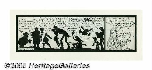 <B>Al Capp Studio - Li'l Abner Daily Comic Strip Original Art, dated 12-14-55 (United Features Syndicate, 1955).</B></I> Marryin' Sam's license to wed has expired, so Tiny Yokum, Li'l Abner's brother, narrowly escapes marriage on Sadie Hawkins Day. Meanwhile, the Bald Iggle faces emminent execution. The image area of this daily measures 5.5" x 19". There are very minor residue areas in panel one, possibly left by Zipatone film that has slipped off; otherwise the condition of the art is Excellent. Here's a chance to own a delightful Dogpatch daily featuring Sadie Hawkins Day!