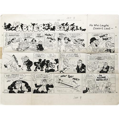 <B>Al Capp Studio - Li'l Abner Sunday Comic Strip Original Art, dated 1-9-66 (Chicago Tribune, 1966).</B></I> Boffo Nagurski wrote the perfect comedy gag. Anyone who reads it <I>dies laughing</B></I> -- and that includes Boffo himself! This Sunday, titled, "He Who Laughs Doesn't Last," features a gaggle of lovely ladies and a gag page with a perilous punchline.The art has been cut between the three tiers into three separate pieces, which have a combined image area of 27" x 19". There is some light aging; otherwise the art is in Very Good condition.
