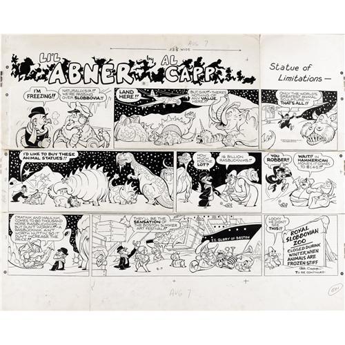 <B>Al Capp Studio - Li'l Abner Sunday Comic Strip Original Art, dated 8-7-66 (Chicago Tribune, 1966).</B></I> The entire animal collection of the Royal Slobbovian Zoo is sold for 16 billion Rasbucknicks (that's $1.45 in "Hammerican" money), to a rich entrepreneur from Boston, in this snowy Sunday strip, titled "Statue of Limitations." As most readers knew, Capp's fictional frozen hellhole was a thinly disguised Siberia. The art has been cut between the three tiers into three separate pieces, with a combined image area of 27" x 19". There is some light aging; otherwise the art is in Very Good condition.