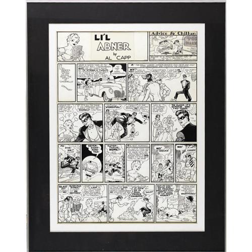 <B>Al Capp Studio - Li'l Abner Sunday Comic Strip Original Art, dated 7-10-38 (United Features Syndicate, 1938).</B></I> Li'l Abner, star of the feature regarded by many as the greatest comic strip of all time, plays the part of Cinderella in this early, whimsical Sunday. This strip has an image area of approximately 19" x 26". The title logo in the top tier is a replacement, the Sunday was cut between each panel tier and later rejoined; otherwise, the art is in Excellent condition. This strip has been professionally framed, and is sure to make a treasured addition to any <I>Li'l Abner</B></I> fan's art collection. <I>From the Estate of Bruce Hamilton.</B></I> <BR><BR><B>Important notice:</B> Heritage usually auctions material at the rate of 200-250 lots per hour. On some occasions eBay Live bid software or the Internet may not be able to keep up with the pace of the auction. We recommend placing a realistic absentee bid now as insurance to avoid disappointment. Occasionally the auctioneer may eliminate or reject an eBay Live bid, and the auctioneer may also reopen a lot after the close of the eBay live bidding (usually because we missed an audience bid), and may reject your bid even if it shows you as the winning bidder. By bidding via eBay Live, you agree that Heritage may award the lot to another bidder at its sole discretion under the circumstances described above or any other reasonable circumstances. Since eBay bids are not shown to us until we open the lot on the floor, we treat those bids just like floor bids. In most cases the floor responds before the eBay bid is presented to us, due to Internet lag time, so for consistency we have made it a policy that floor bids are always considered first over tie eBay live bids. Also please note that all Heritage lots purchased through eBay Live carry a 22.5% Buyer's Premium. Please make sure you read the Terms and Conditions before you bid. This lot is being auctioned in conjunction with a live floor auction by Heritage Auction Galleries. All final auction and invoice information will be supplied by Heritage Auction Galleries, and all other information should be considered preliminary. Lot:41001 <BR><BR><B>Winning Notification and Billing:</B> After the FINAL session in this auction is complete, Heritage will send e-mail and snail mail invoices. This process normally takes several days. All final auction and invoice information will be supplied by Heritage Auction Galleries, and all other information should be considered preliminary. <BR><BR>This auction will be conducted on a live auction floor and over the Internet through eBay Live. If you choose to place an absentee bid, please take a moment to <font color='#0000ff'><u><a href='http://pages.ebay.com/liveauctions/help/before/laabsentee.html'>learn how eBay Live absentee bidding works</a></u></font><font color='#000000'>